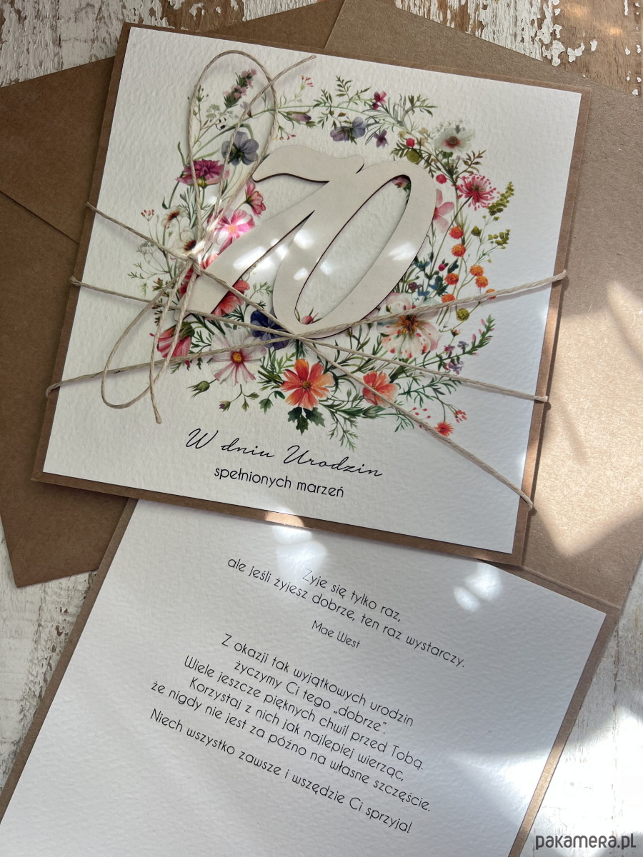 Kartka urodzinowa ręcznie robiona wykonana jest na bazie papieru kraftowego z użyciem starannie wyselekcjonowanego papieru bawełnianego w kolorze śmietanki z nadrukiem oraz tekturkową ozdobą. Kartka przewiązana jest lnianym sznureczkiem.