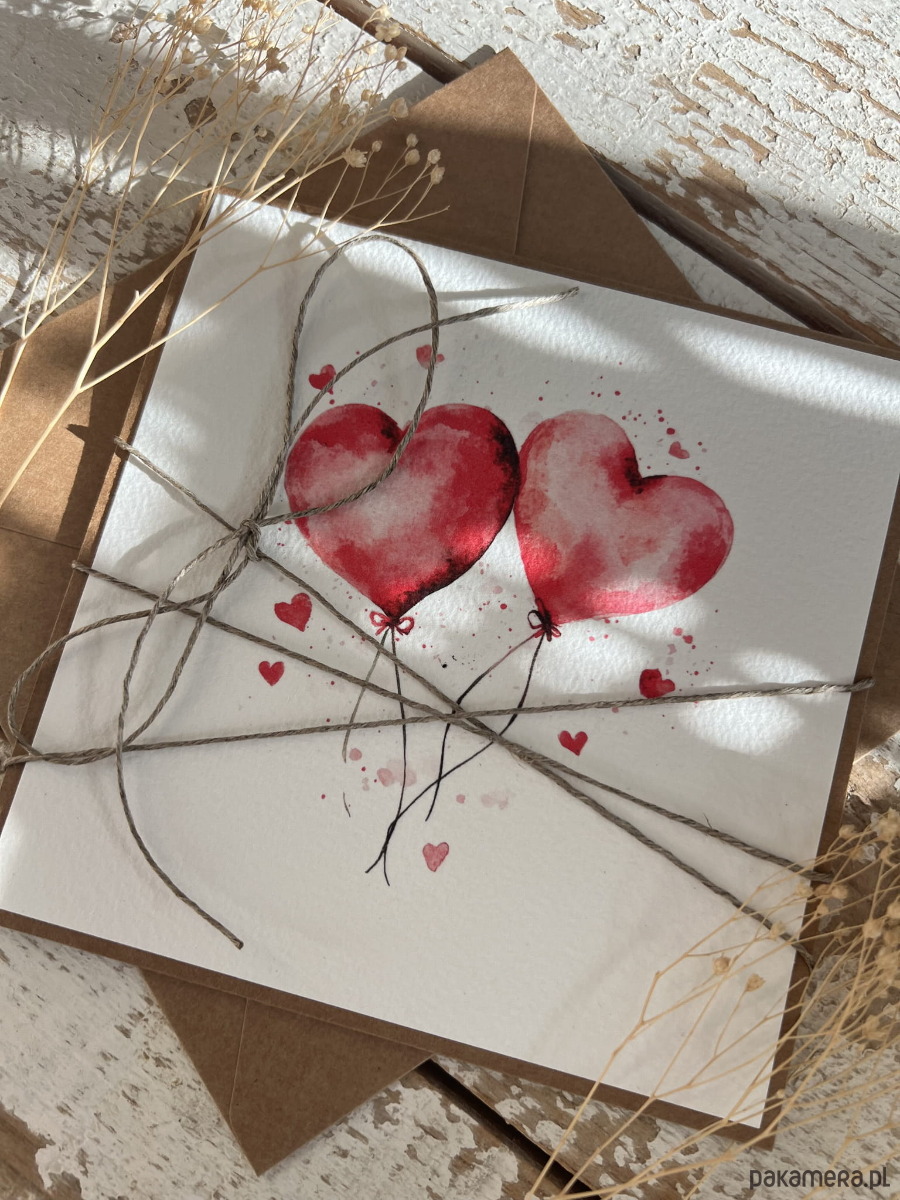 Wyjątkowa ręcznie robiona kartka na walentynki - walentynka z sercem z balonami (p)W środku wklejona jest kartka z papieru bawełnianego, gotowa do wypisania życzeń odręcznie.