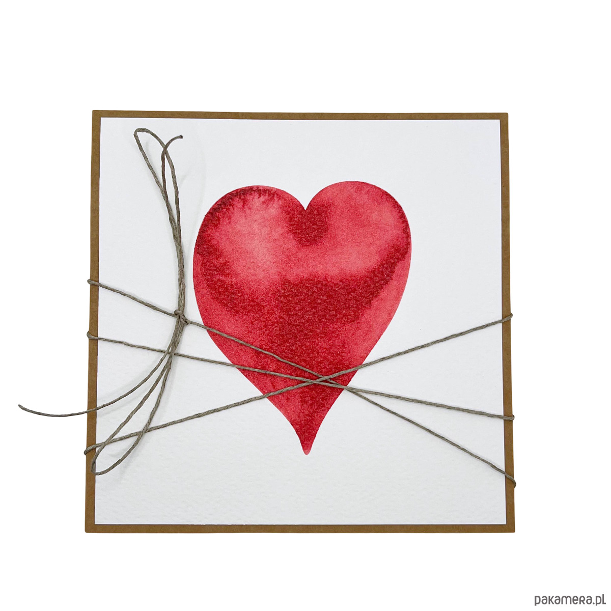 Wymiar kartki 14x14 cm w zestawie z brązową kopertą. Kartka przewiązana lnianym sznureczkiem.