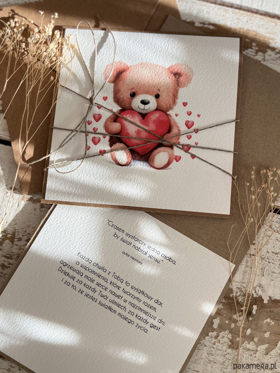 Wyjątkowa ręcznie robiona kartka prezent na walentynki, walentynkowa - walentynka z misiem z sercem - miś z sercem