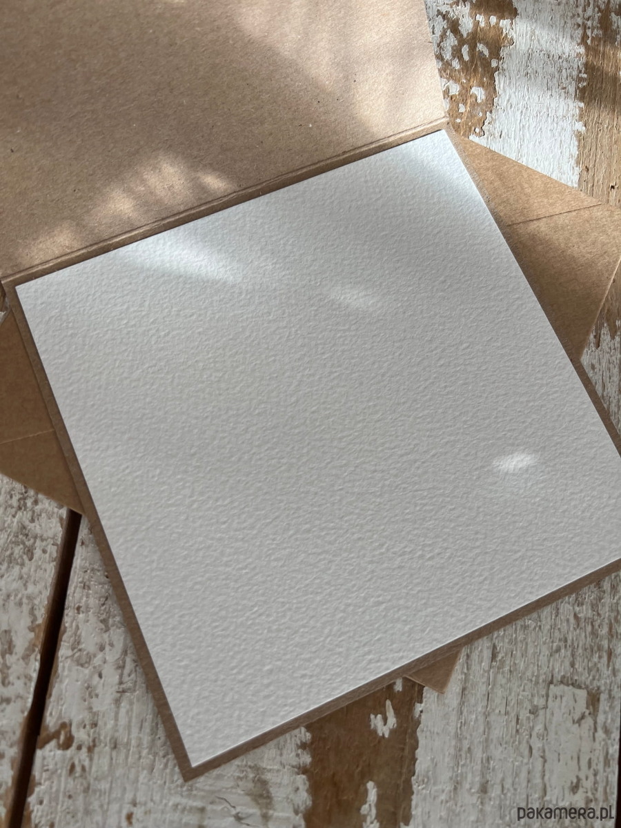 Wymiar kartki 14x14 cm w zestawie z brązową kopertą.