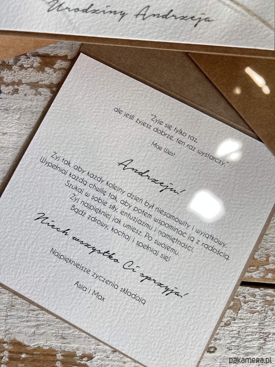 Personalizowana kartka ręcznie robiona wykonana jest na bazie papieru kraftowego z użyciem starannie wyselekcjonowanego papieru bawełnianego w kolorze śmietanki z nadrukiem oraz tekturkową ozdobą. Kartka przewiązana jest lnianym sznureczkiem.