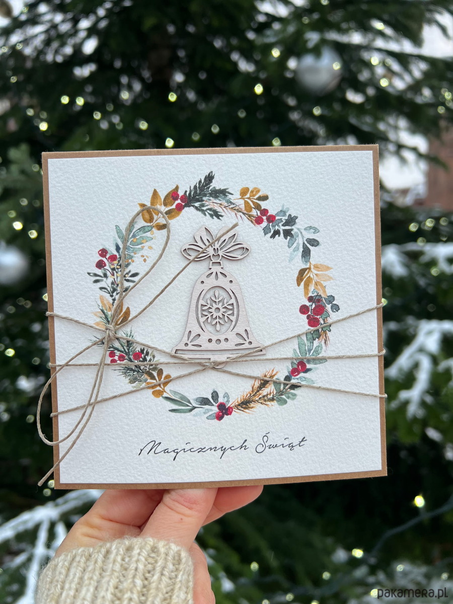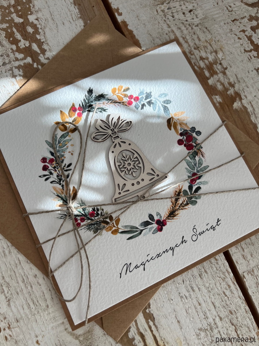 Wyjątkowa stylowa kartka ekologiczna świąteczna + najpiękniejsze życzenia na Boże Narodzenie świąteczny wianek, dzwonek - dekoracja - kartki firmowe z logo
