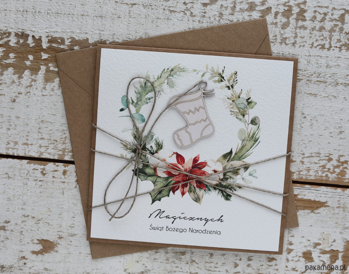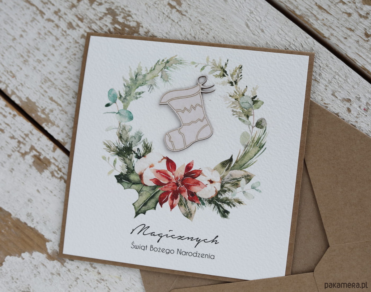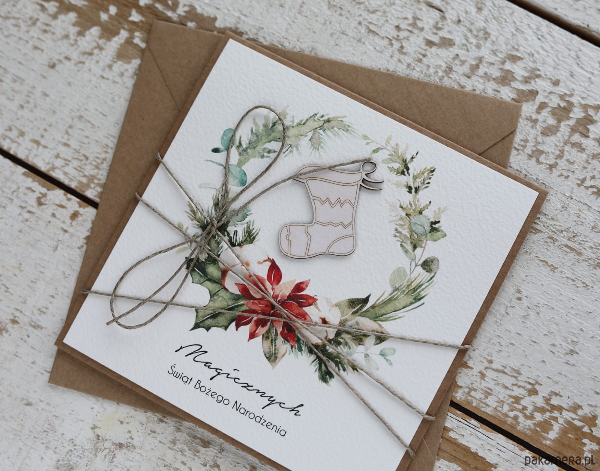 Wyjątkowa stylowa kartka ekologiczna świąteczna + najpiękniejsze życzenia na Boże Narodzenie świąteczny wianek + świąteczna skarpeta