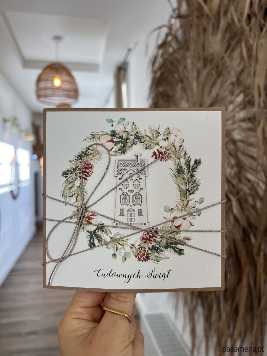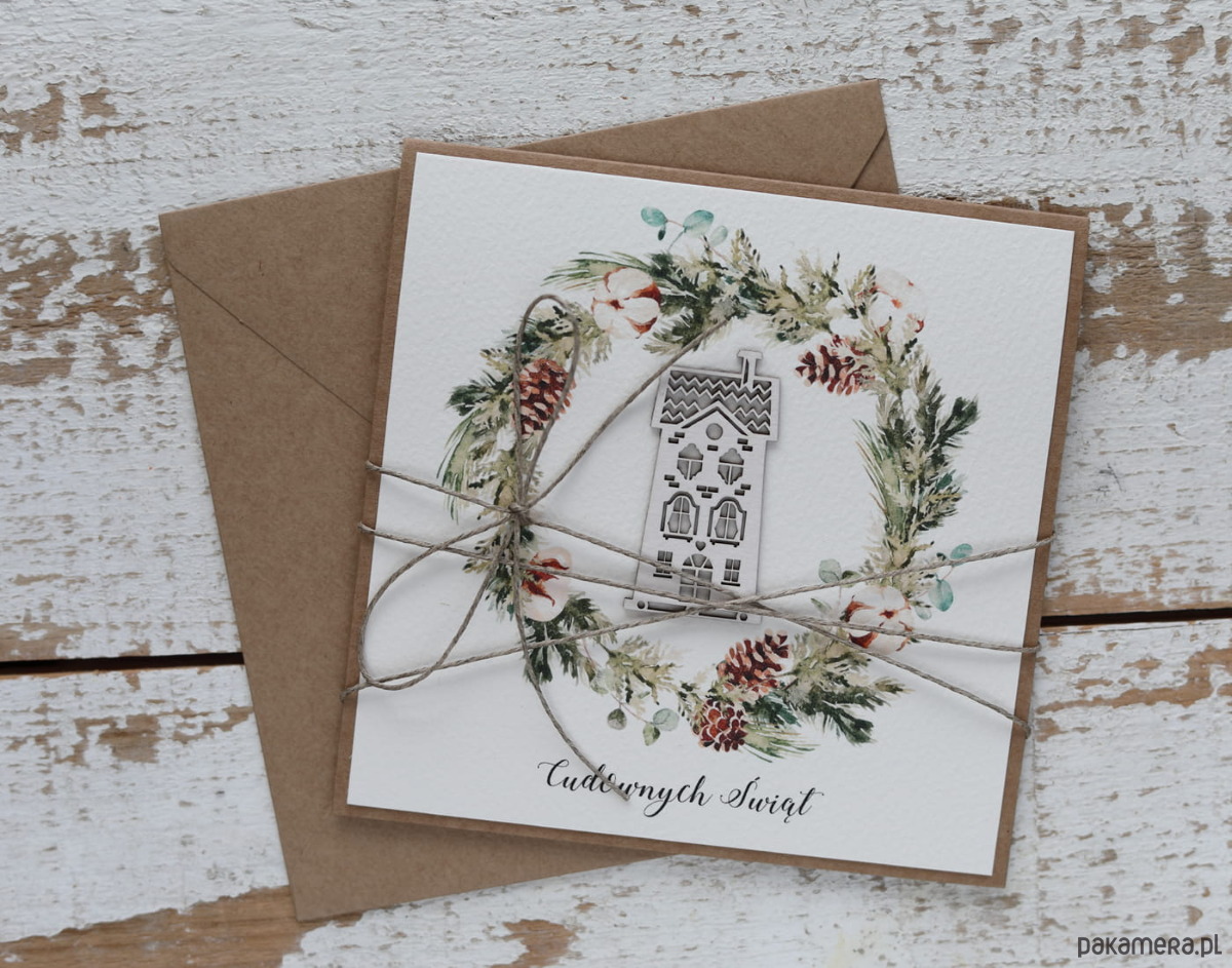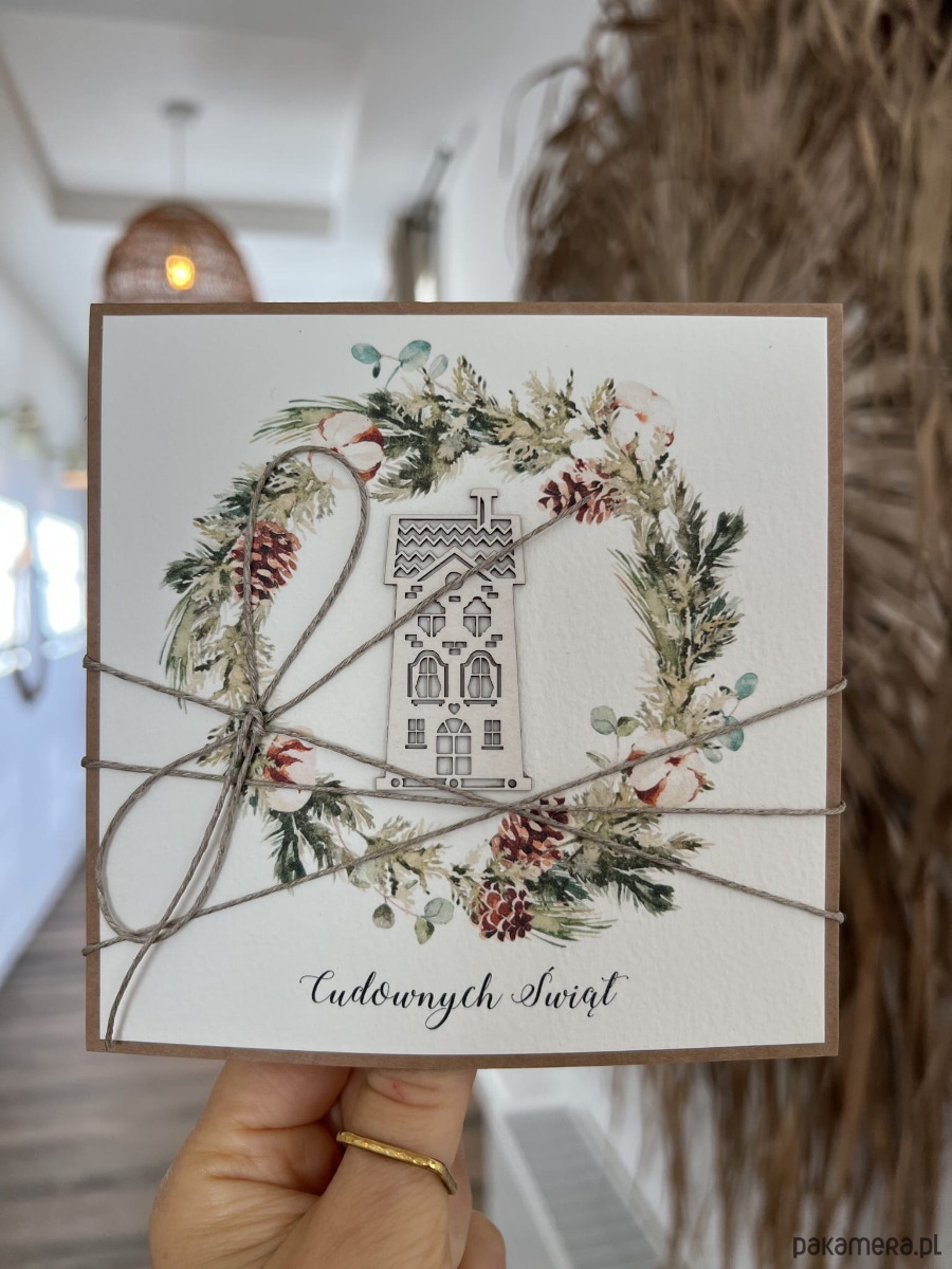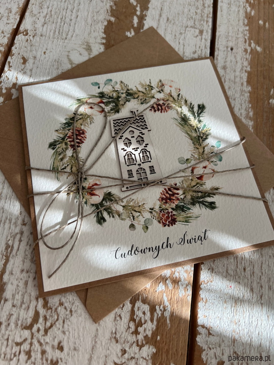Wyjątkowa stylowa kartka ekologiczna świąteczna + najpiękniejsze życzenia na Boże Narodzenie świąteczny wianek i dom