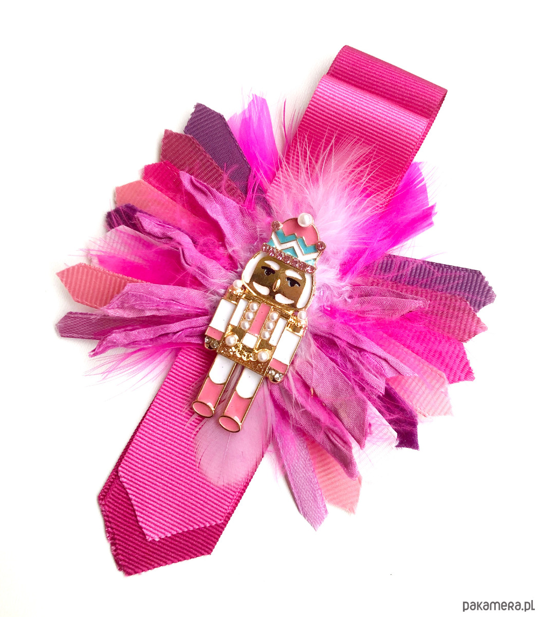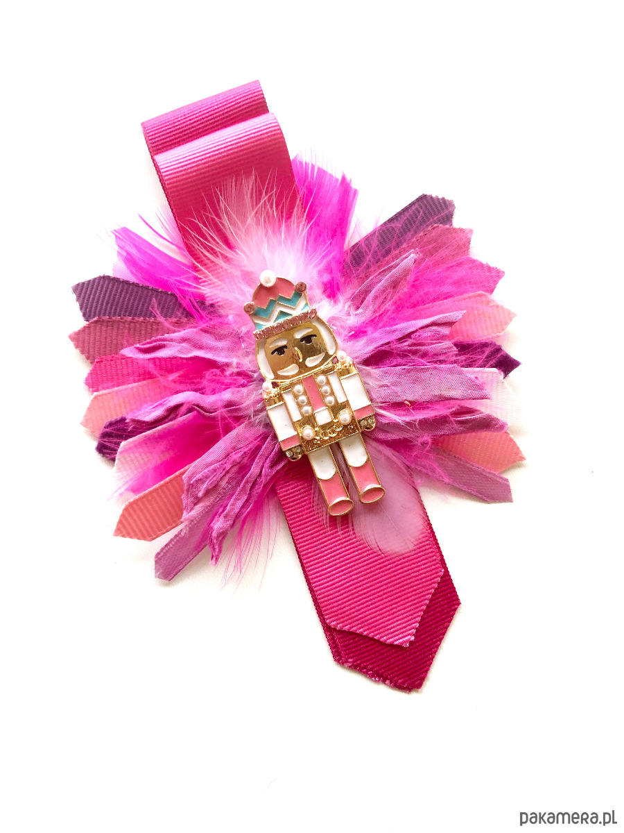 Wyjątkowa broszka stworzona z różnych materiałów: tasiemek, piór, koralików w odcieniach różu i fioletu z dziadkiem do orzechów w środku. Długość 13 cm, szerokość 8 cm. Idealna do kurtek. marynarek czy płaszczy.