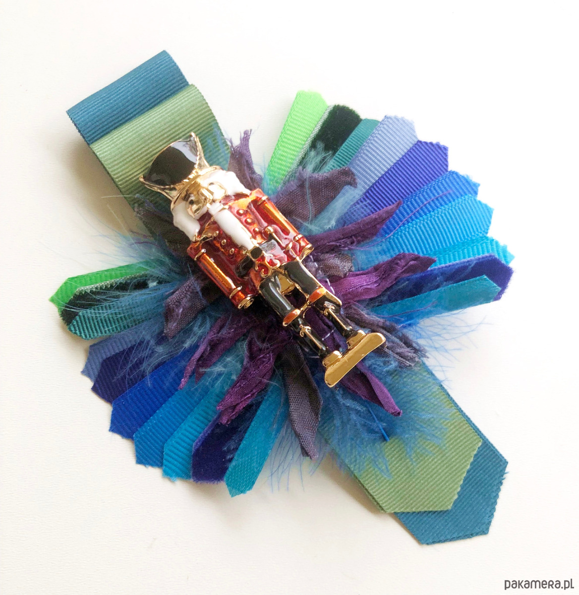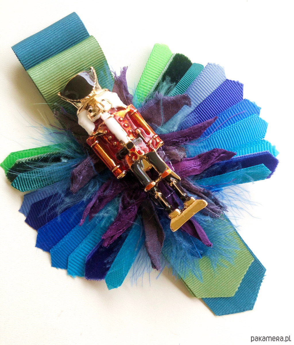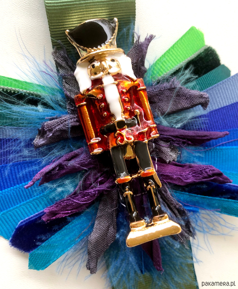 Wyjątkowa broszka stworzona z różnych materiałów: tasiemek, piór, koralików w odcieniach różu i fioletu z dziadkiem do orzechów w środku. Długość 13 cm, szerokość 8 cm. Idealna do kurtek. marynarek czy płaszczy.