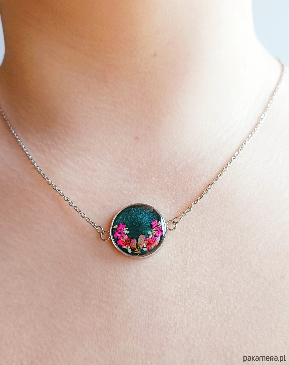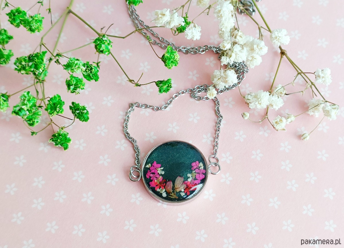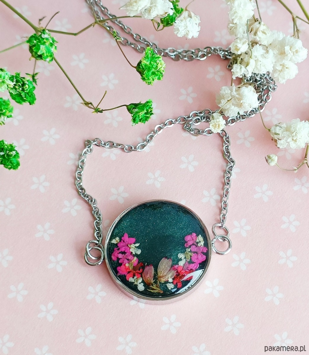 Materiały: stal szlachetna w kolorze srebrnym, wysokiej jakości żywica, prawdziwe rośliny.