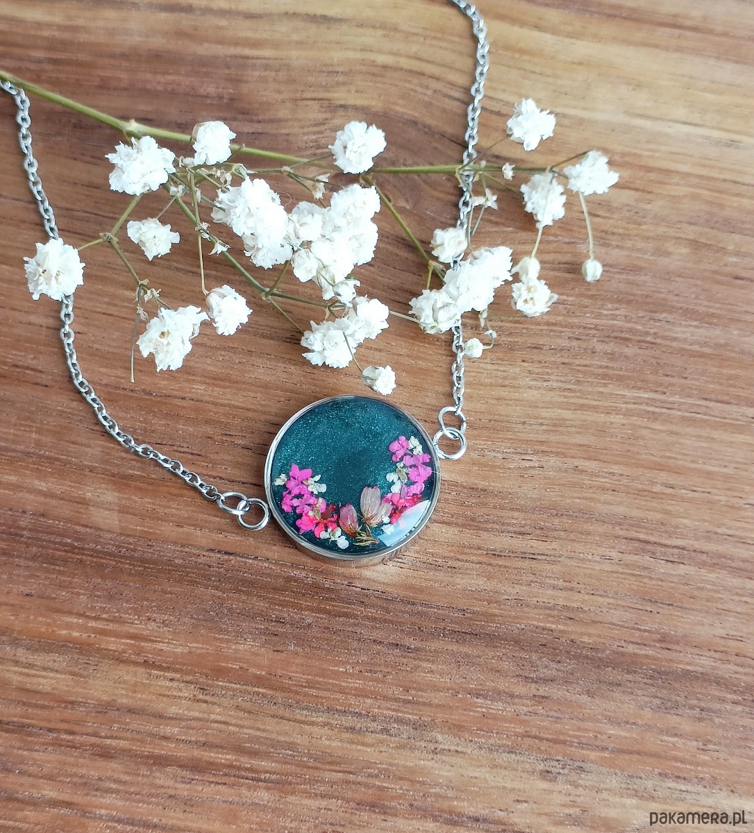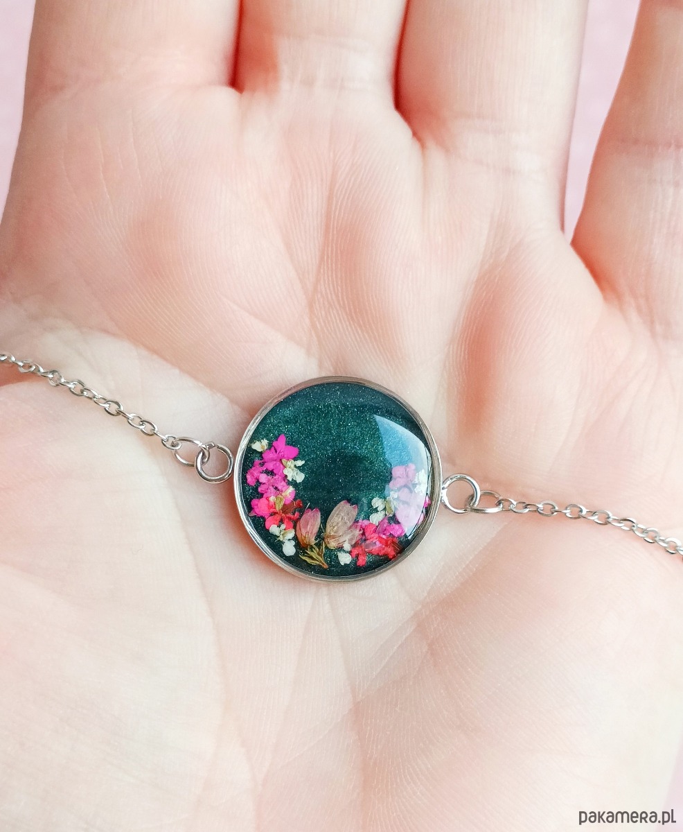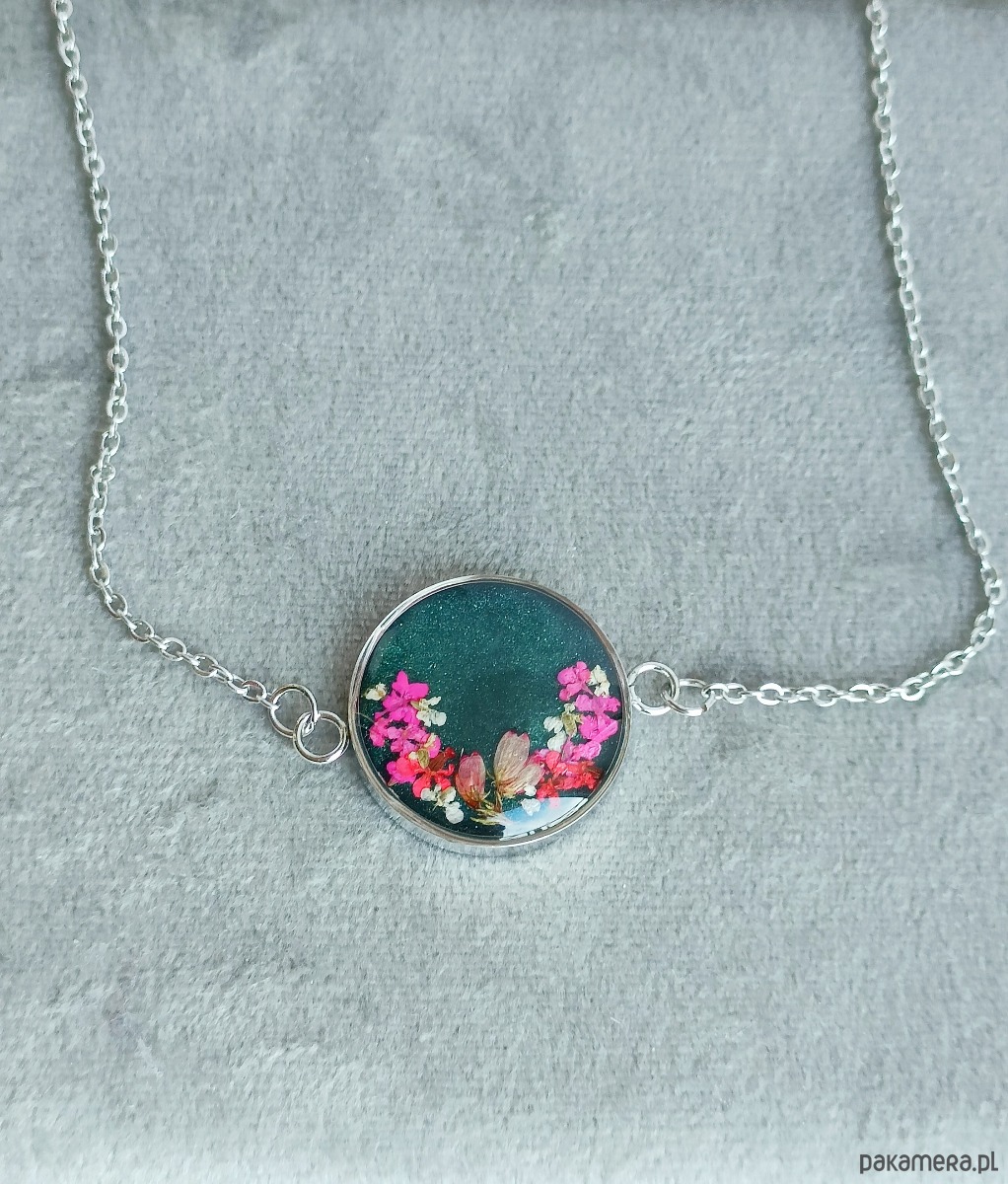 Materiały: stal szlachetna w kolorze srebrnym, wysokiej jakości żywica, prawdziwe rośliny.
