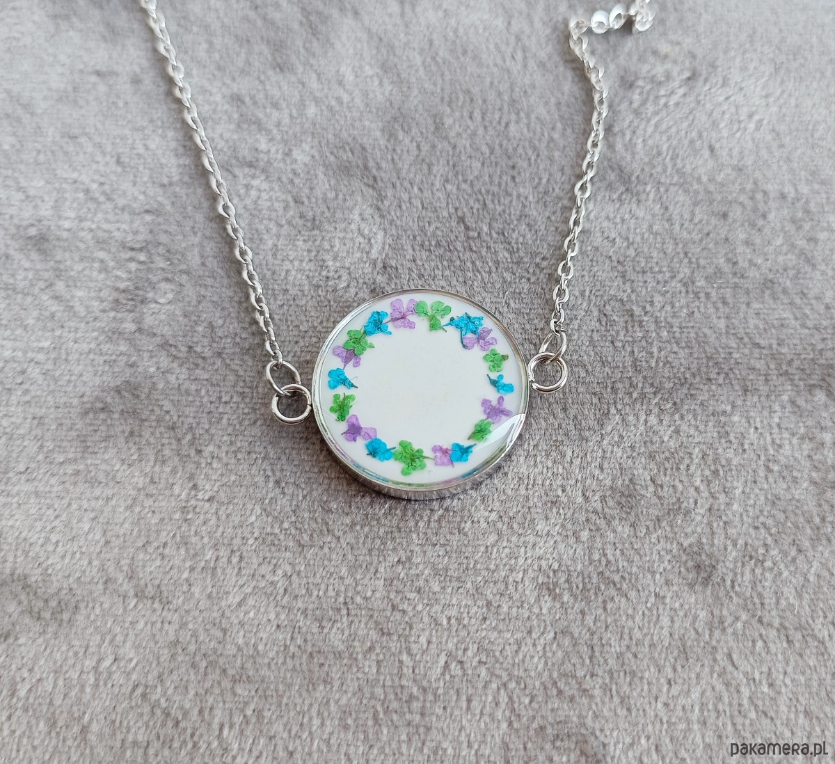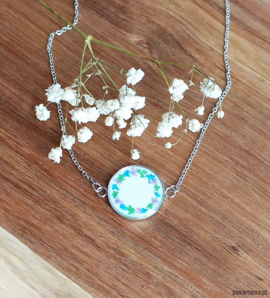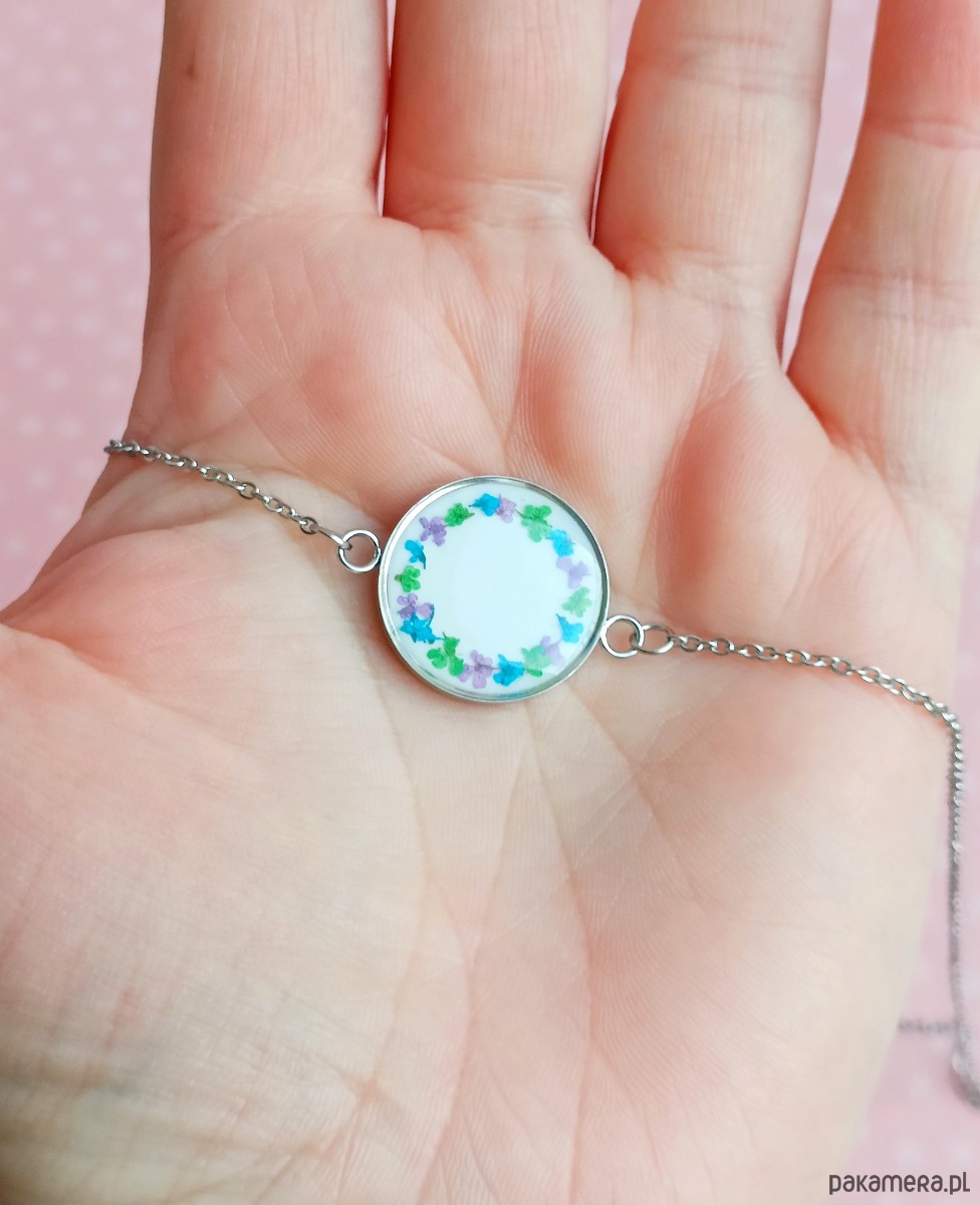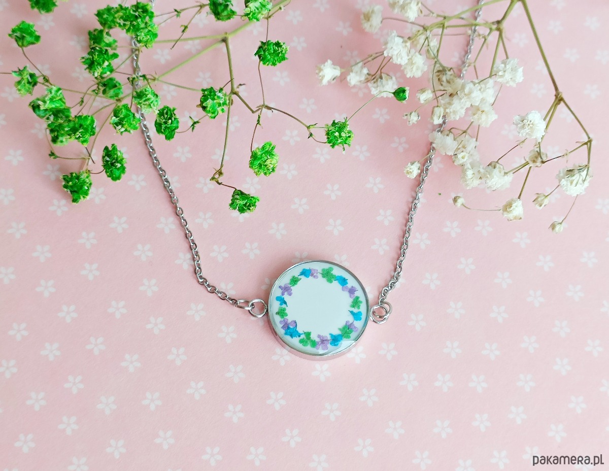 Materiały: stal szlachetna w kolorze srebrnym, wysokiej jakości żywica, prawdziwe rośliny.