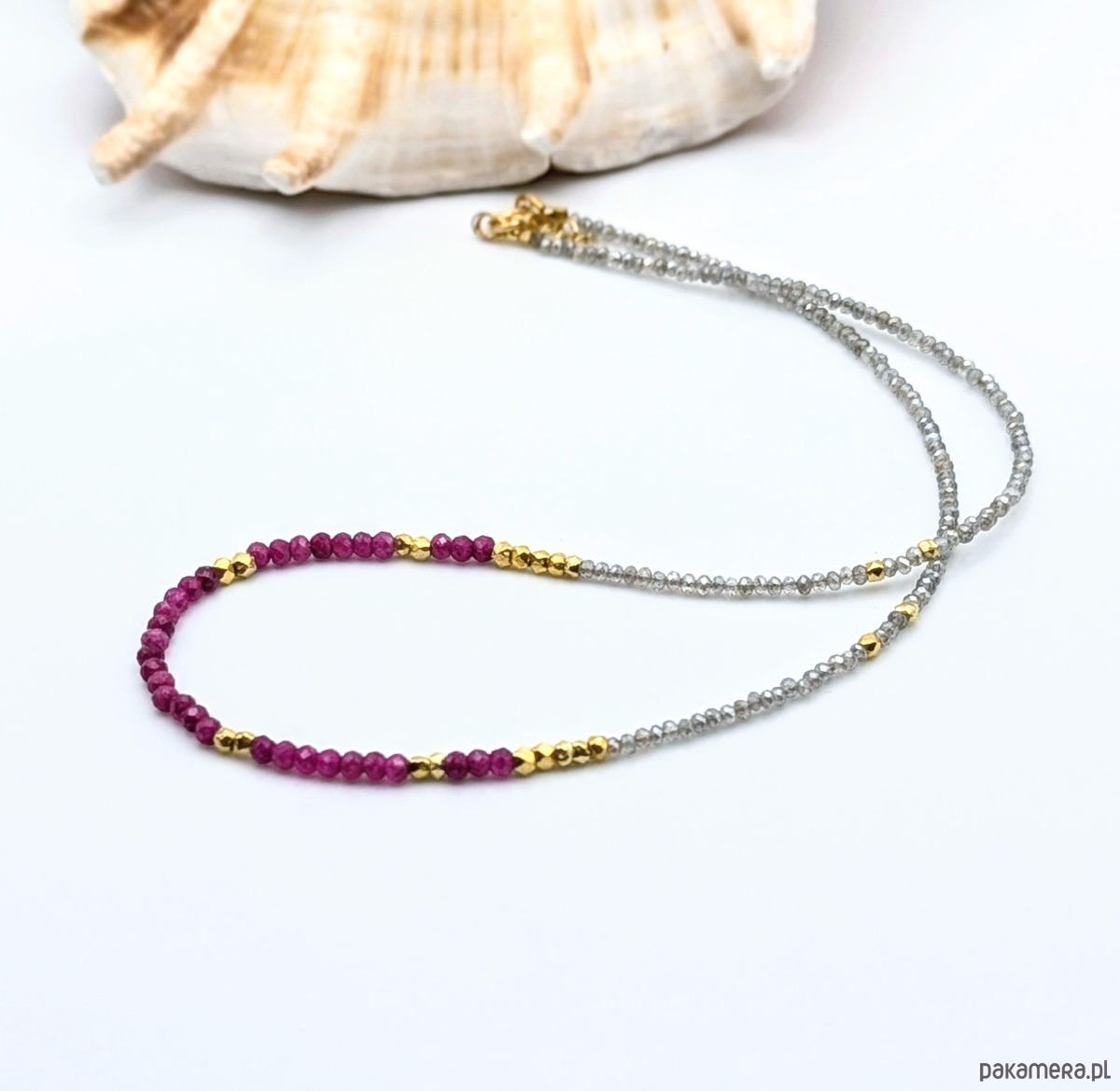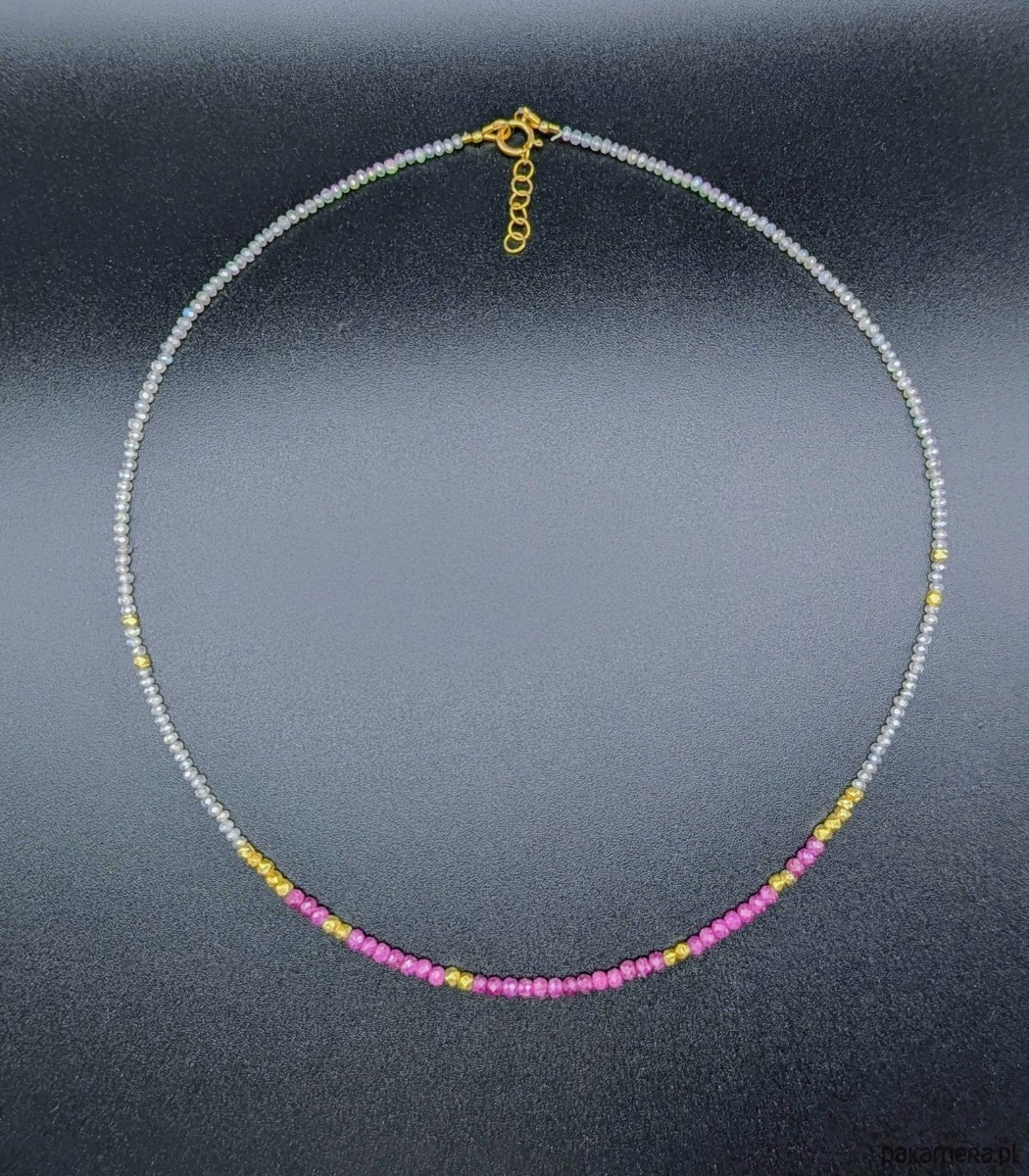Subtelny i ekskluzywny naszyjnik z nasyconymi kolorem rubinami i lśniącymi drobnymi labradorytami. Labradoryt jest fasetowany, pięknie szlifowany. Przy tym rozmiarze daje efekt iskrzenia. Prawdziwe wyzwanie podczas nawlekania, ale też w trakcie robienia zdjęć (trudno na fotografii oddać rzeczywisty efekt migoczących kamyków). Rubiny w kształcie fasetowanych oponek wraz ze złoconymi przekładkami stanowią piękną ozdobę. Naszyjnik jest elegancki, idealny na prezent.