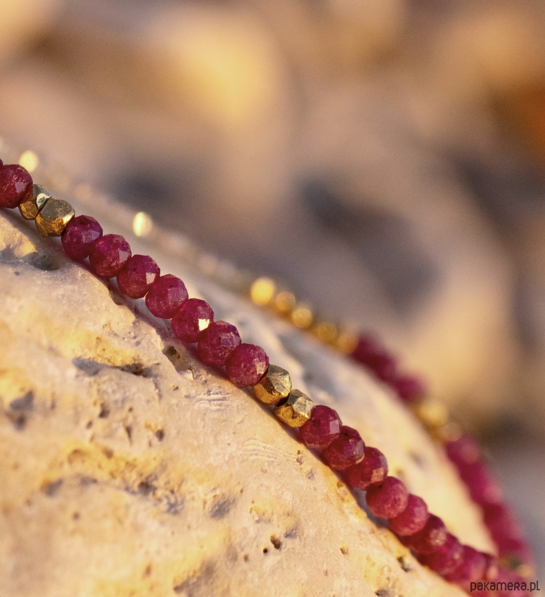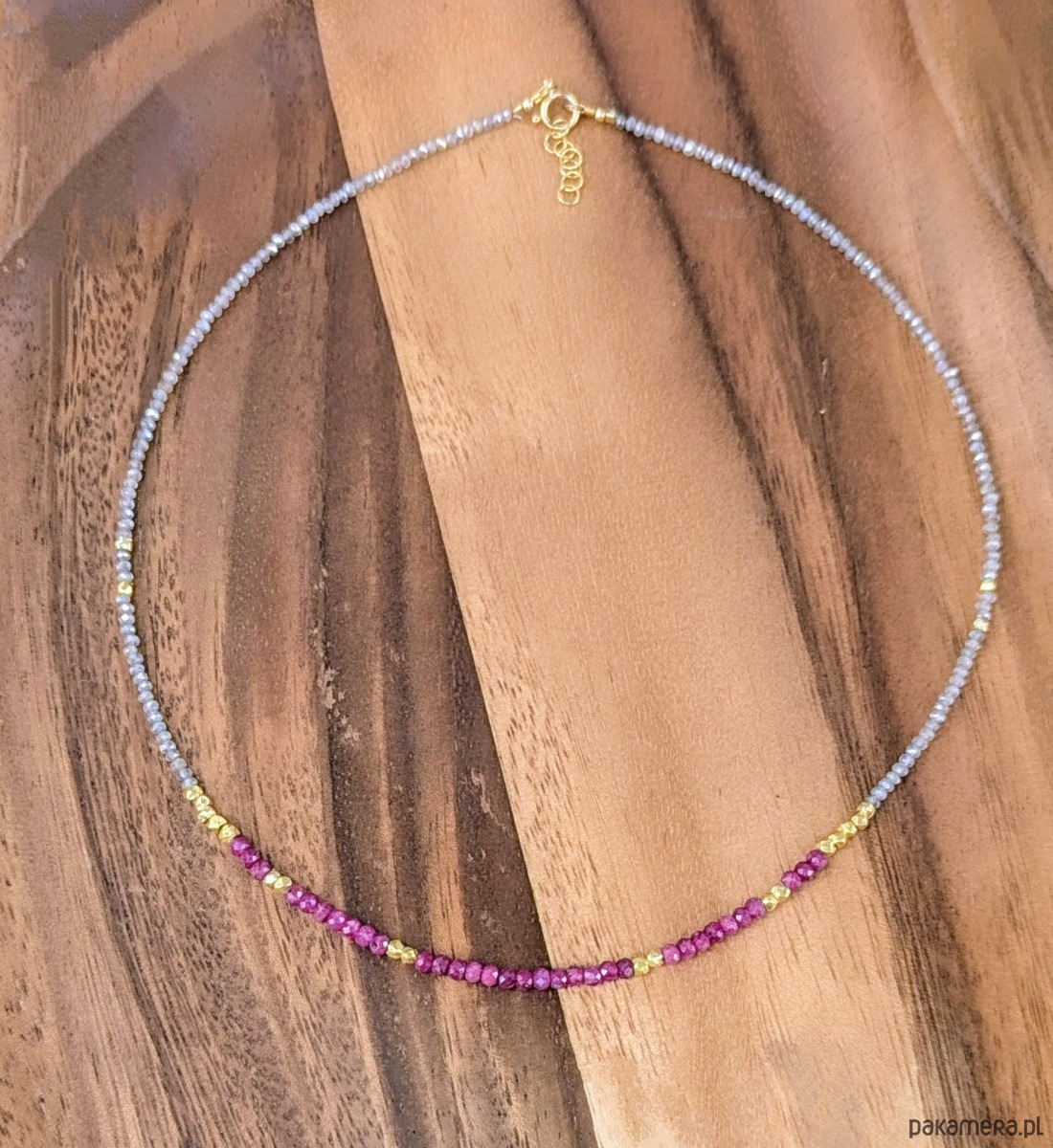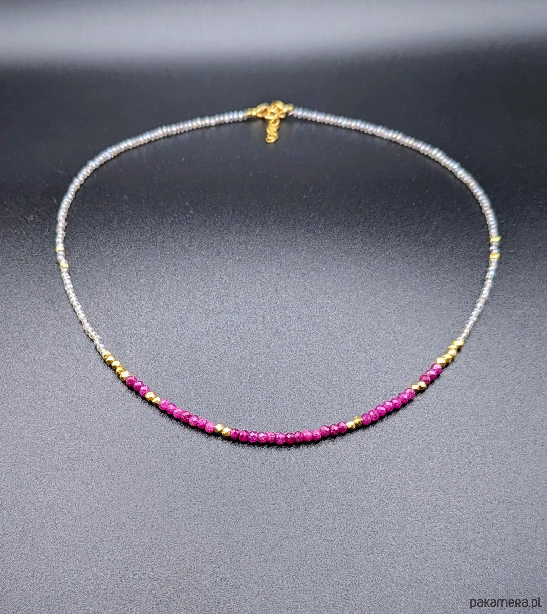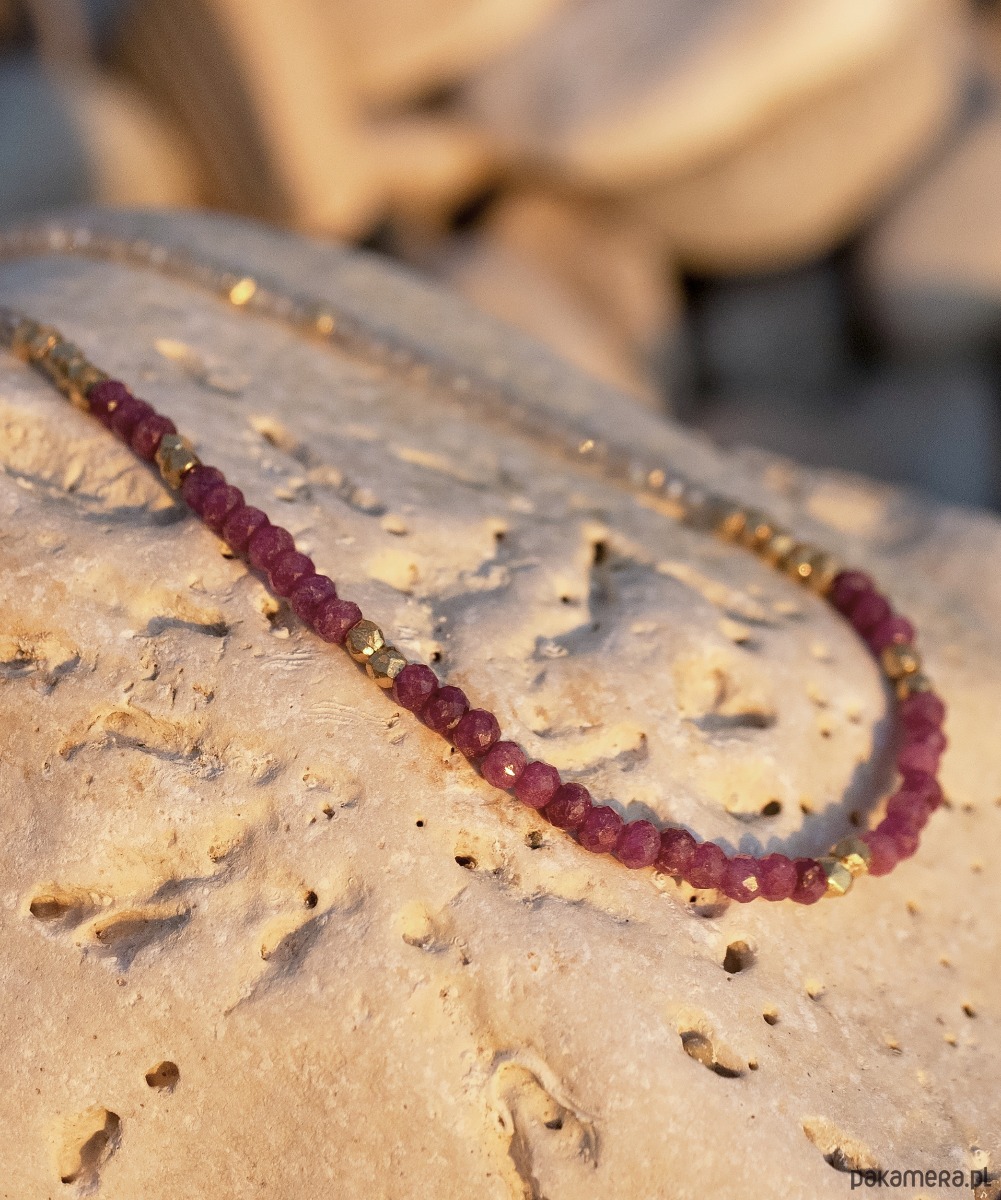 Subtelny i ekskluzywny naszyjnik z nasyconymi kolorem rubinami i lśniącymi drobnymi labradorytami. Labradoryt jest fasetowany, pięknie szlifowany. Przy tym rozmiarze daje efekt iskrzenia. Prawdziwe wyzwanie podczas nawlekania, ale też w trakcie robienia zdjęć (trudno na fotografii oddać rzeczywisty efekt migoczących kamyków). Rubiny w kształcie fasetowanych oponek wraz ze złoconymi przekładkami stanowią piękną ozdobę. Naszyjnik jest elegancki, idealny na prezent.