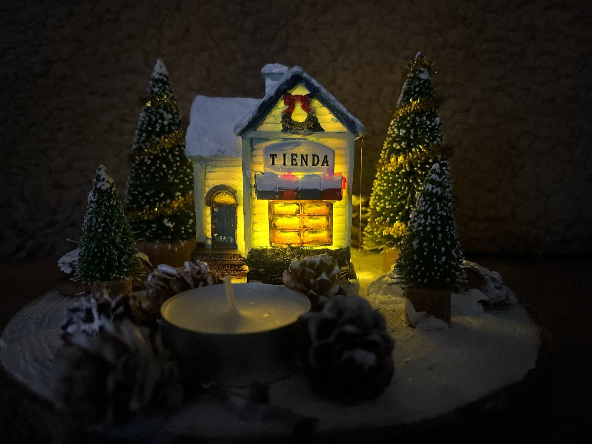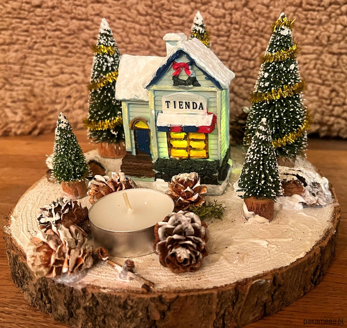 Ten ręcznie wykonany stroik to idealna dekoracja, która wprowadzi ciepły, świąteczny nastrój do Twojego domu. Jego centralnym elementem jest uroczy, świecący domek, który roztacza subtelne światło, tworząc magiczną atmosferę. Stroik zdobi również elegancka świeczka, dodająca blasku i przytulności, a towarzyszące jej miniaturowe choinki wprowadzają zimowy, leśny klimat. Całość uzupełniają naturalne szyszki, które podkreślają rustykalny i ekologiczny charakter dekoracji. Postaw go na stole, komodzie lub parapecie i ciesz się unikalnym urokiem świąt.