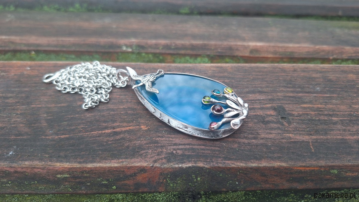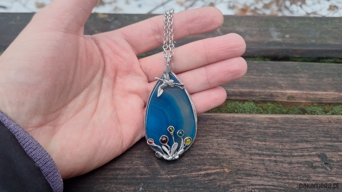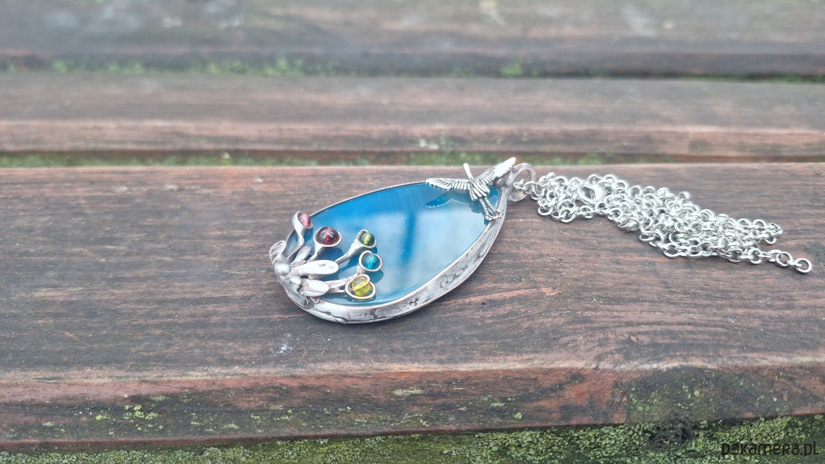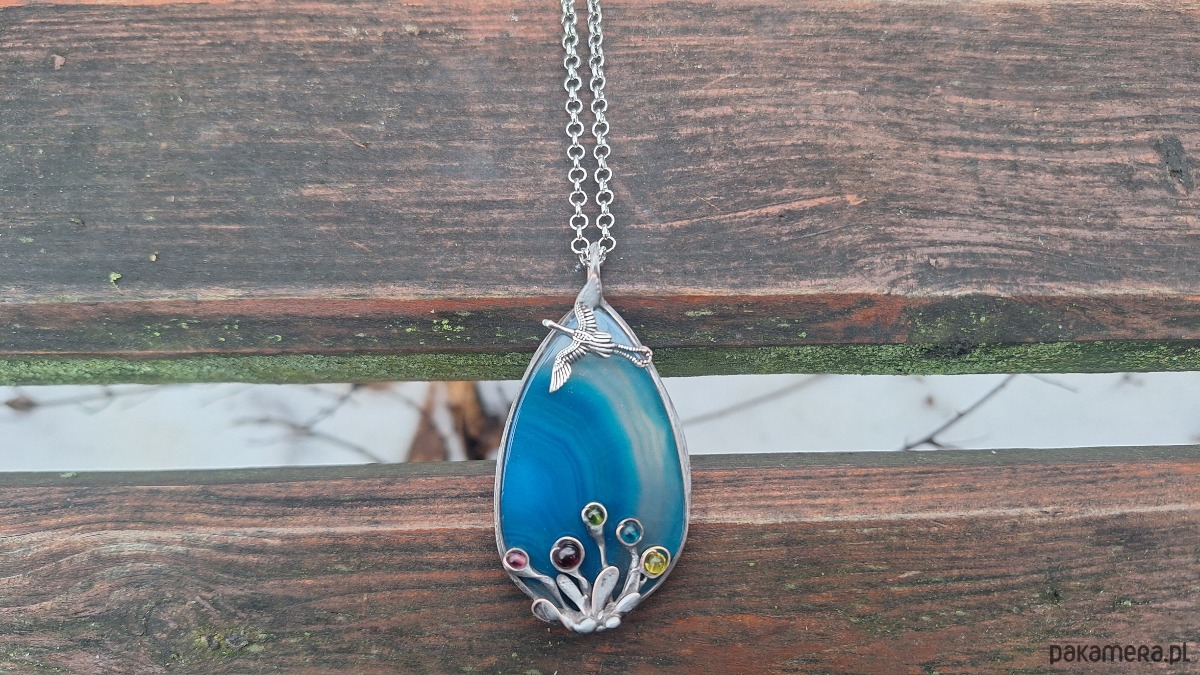 Wisiorek wykonany z miedzi, cyny, szkła i agatu. Wymiary ok. 5.5 na 3 cm. Zawieszony na łańcuszku o długości ok. 50 cm.
