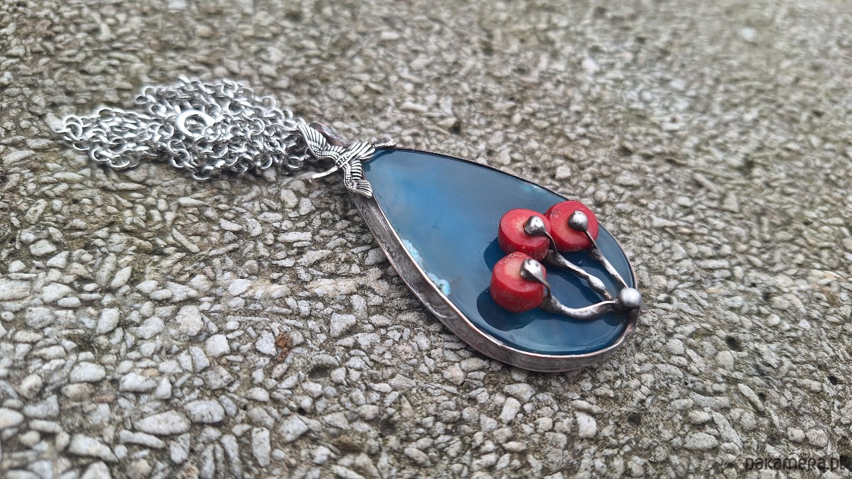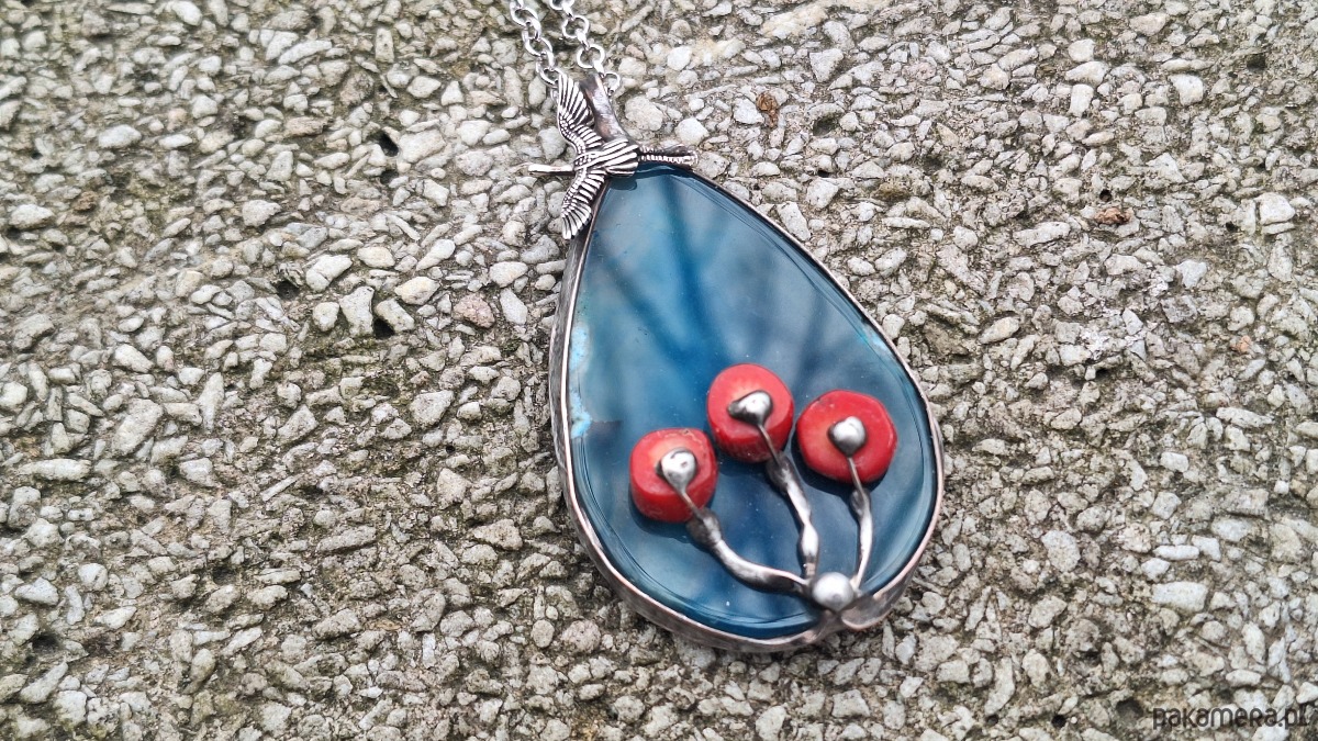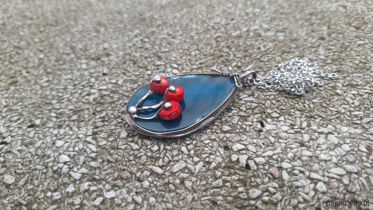 Wisiorek wykonany z miedzi, cyny, koralowców i agatu. Wymiary ok. 6 na 4 cm. Zawieszony na łańcuszku o długości ok. 50 cm.