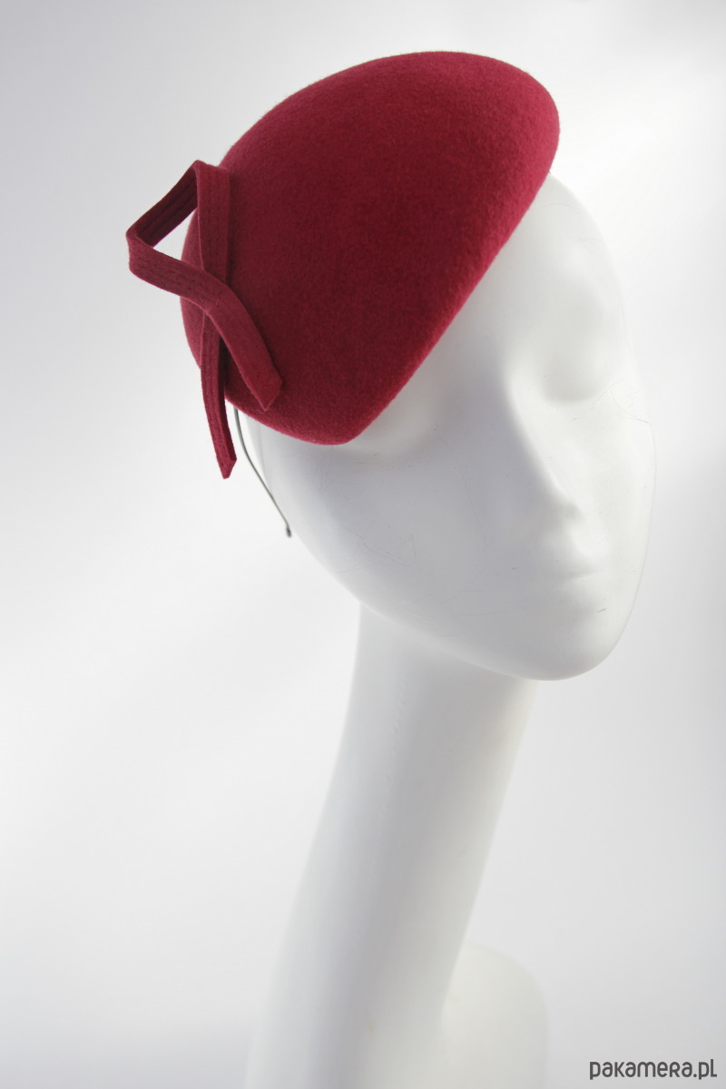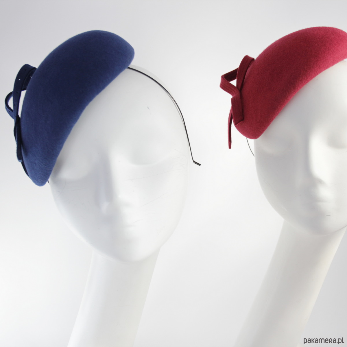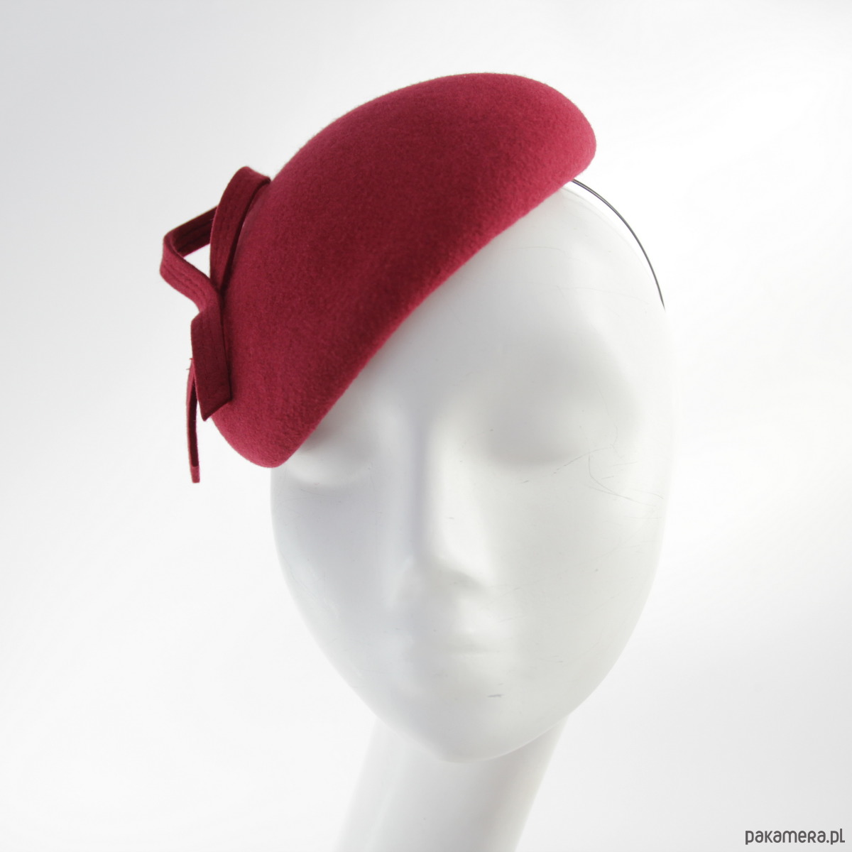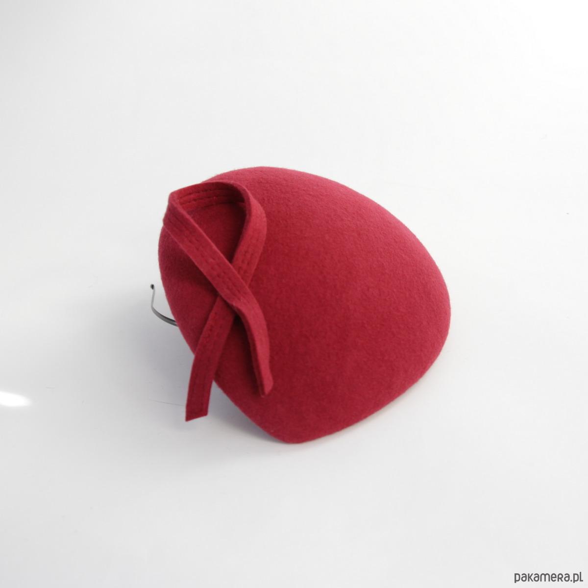 Toczek w kształcie łezki z filcu wełnianego. Ozdobiony kokardą . Zamocowany na cienkiej czarnej metalowej opasce. Wymiary: 15-19 cm.