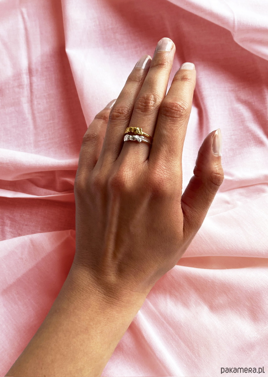 Wiosenny, truskawkowy pierścionek wykonano ze srebra próby 925 złoconego 24k złotem.