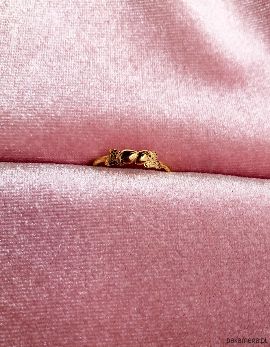 Wiosenny, truskawkowy pierścionek wykonano ze srebra próby 925 złoconego 24k złotem.