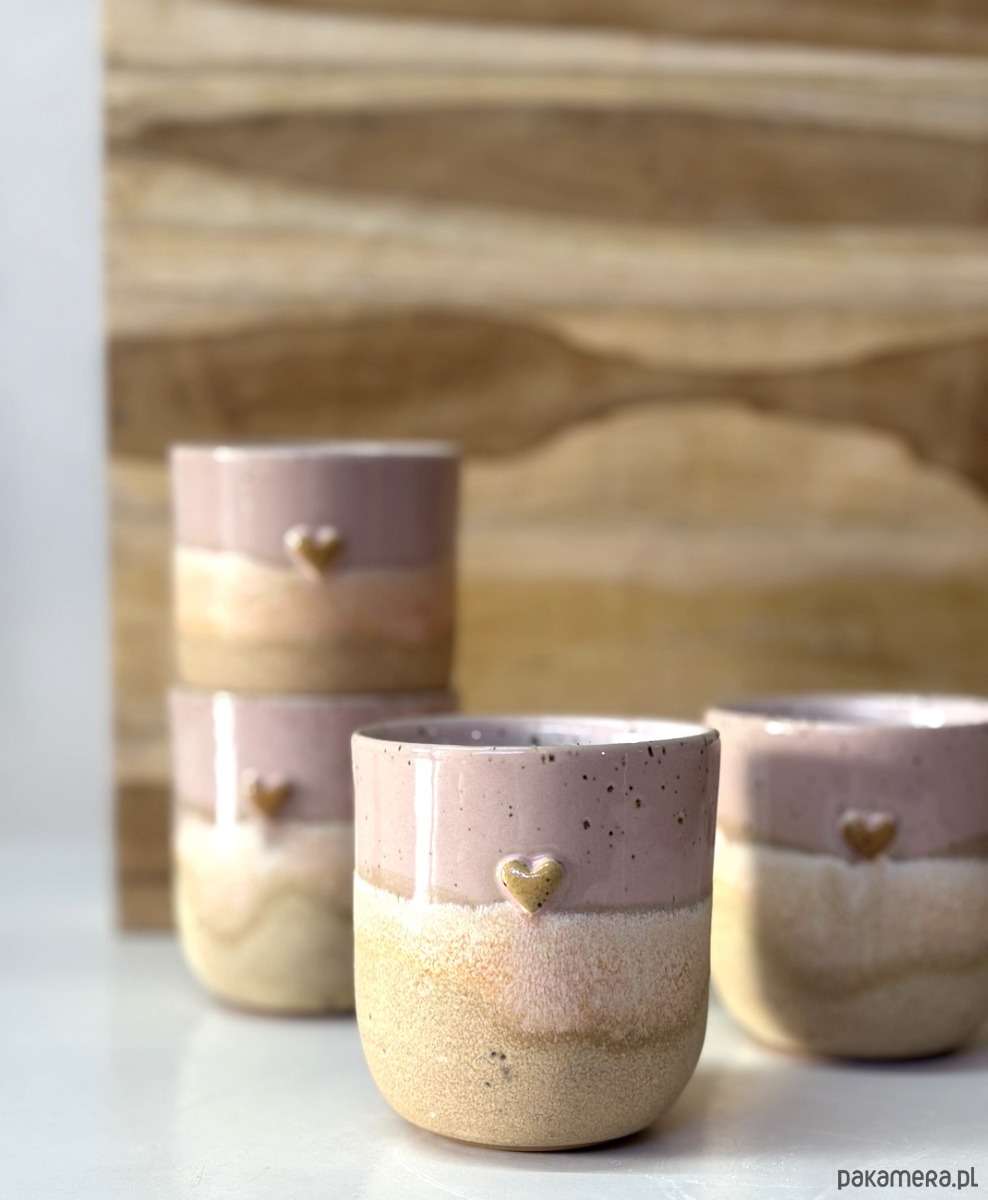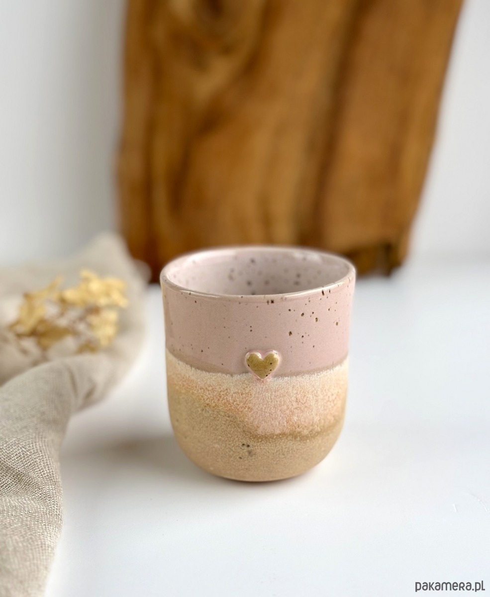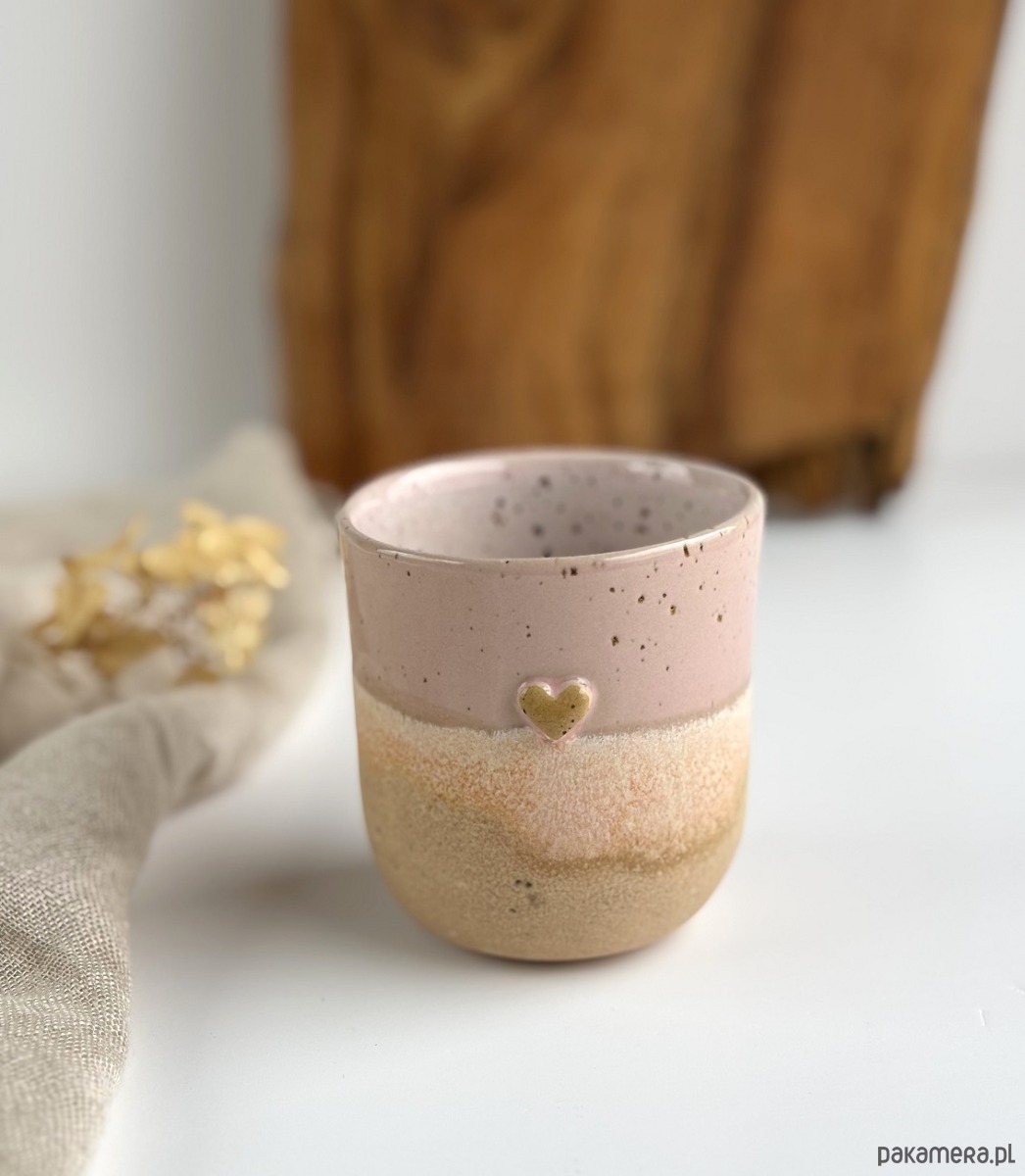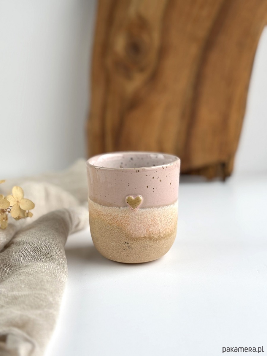 Ręcznie robiony kubek ceramiczny bez uszka z sercem idealny do ulubionej kawy lub herbaty o pojemności około 200 ml.