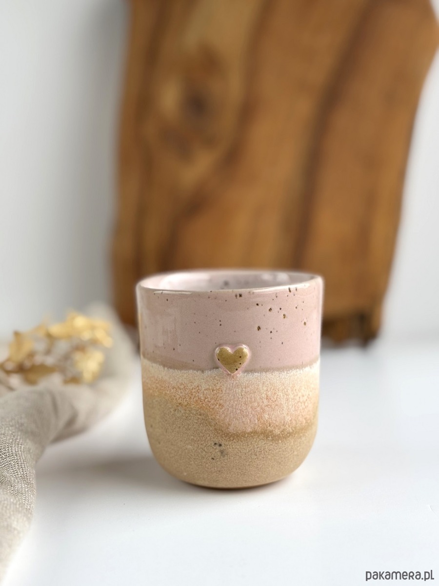 Ręcznie robiony kubek ceramiczny bez uszka z sercem idealny do ulubionej kawy lub herbaty o pojemności około 200 ml.