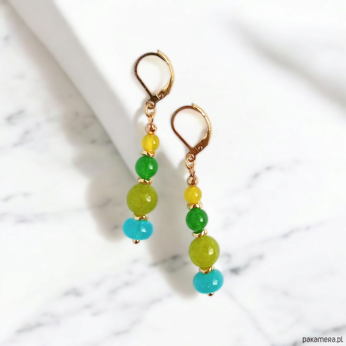 niebanalne kolczyki wykonane z jadeitu w soczystych odcieniach (wielkość 8, 6 i 4mm); przekładki wykonane ze złotego hematytu.