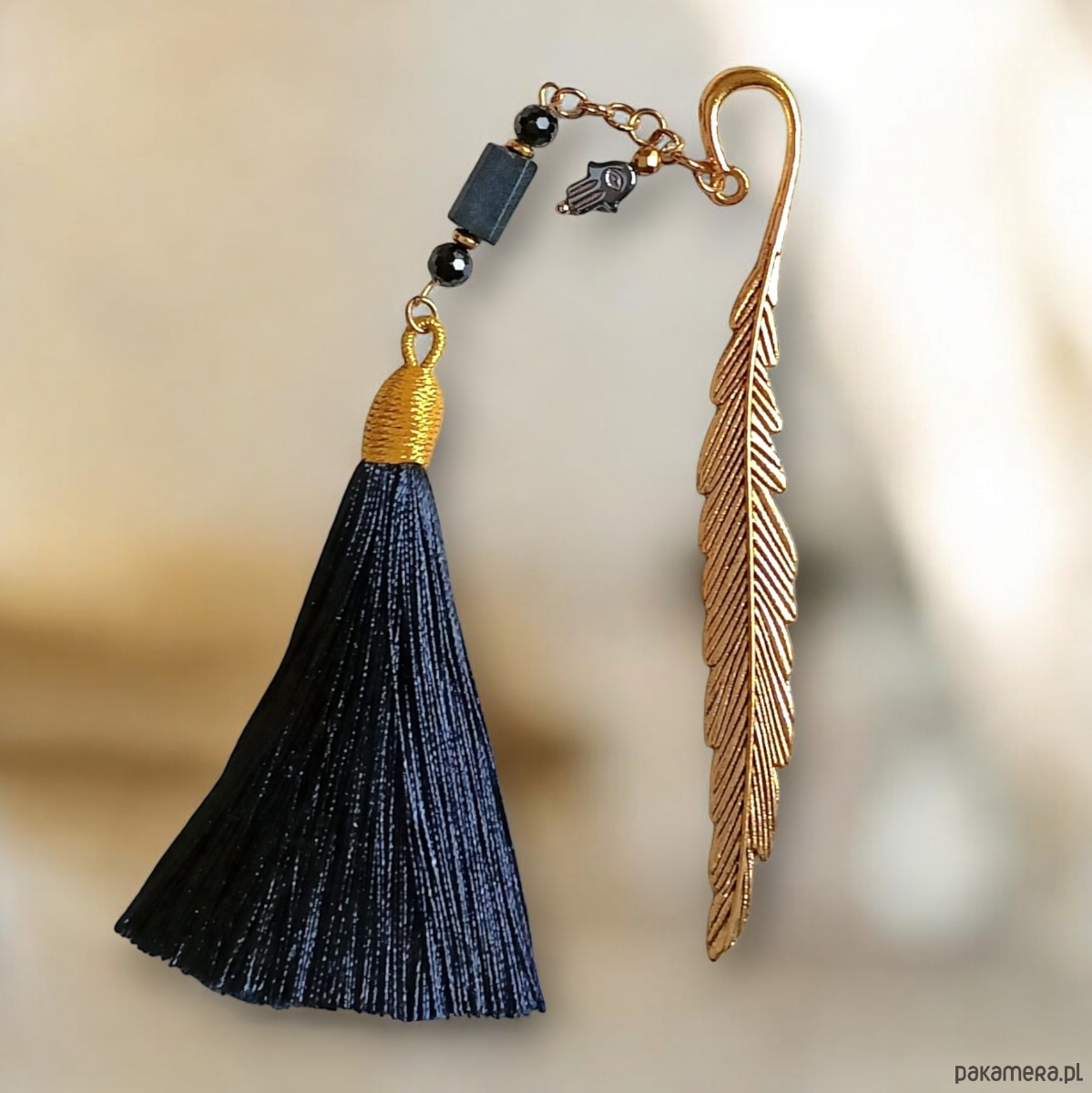 Czarny turmalin (najsilniejszy kamień ochronny) - w dwóch postaciach: surowa bryłka (ok.11mm) i fasetowane kule 6mm, okazały chwost w kolorze czarnym, dodatkowo: zawieszka HAMSA (talizman chroniący od zła) wykonana z rzeźbionego grafitowego hematytu. przekładki: hematyt złoty. baza zakładki - metal w kolorze złota. pozostałe elementy metalowe wykonane z pozłacanej stali szlachetnej. wszystkie poszczególne elementy są ruchome, więc zakładka będzie się ładnie układała. długość samej zakładki (bazy): ok.12cm. .. dł. całego elementu wiszącego: ok.17cm.