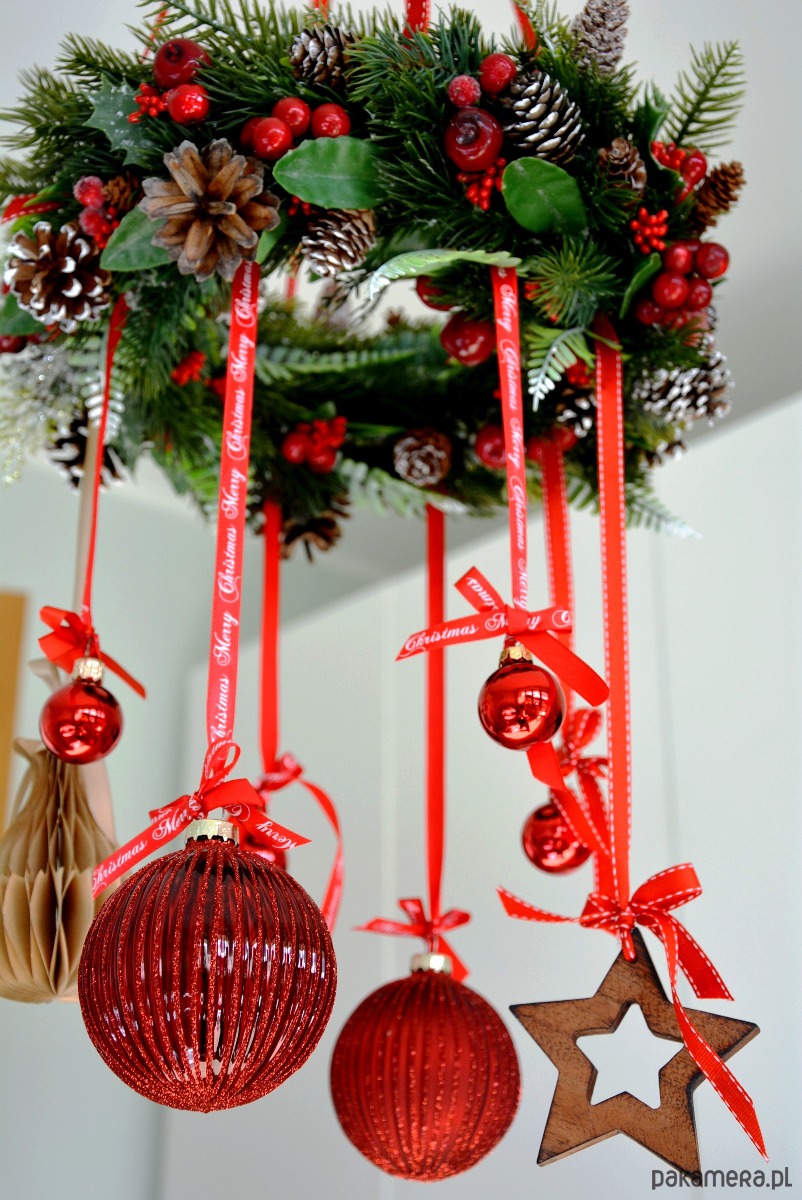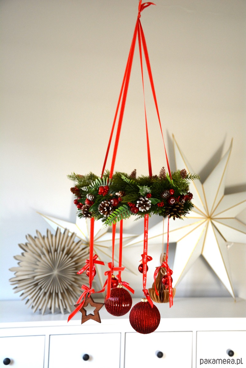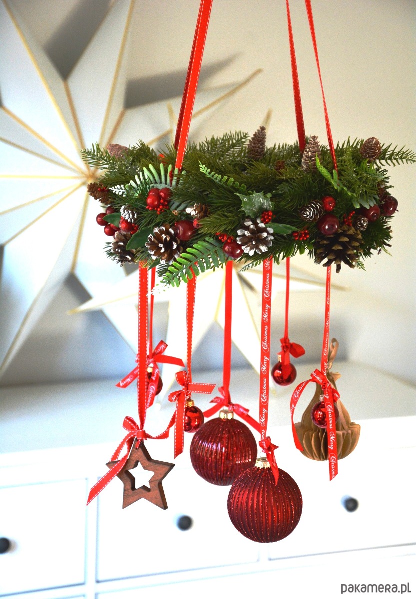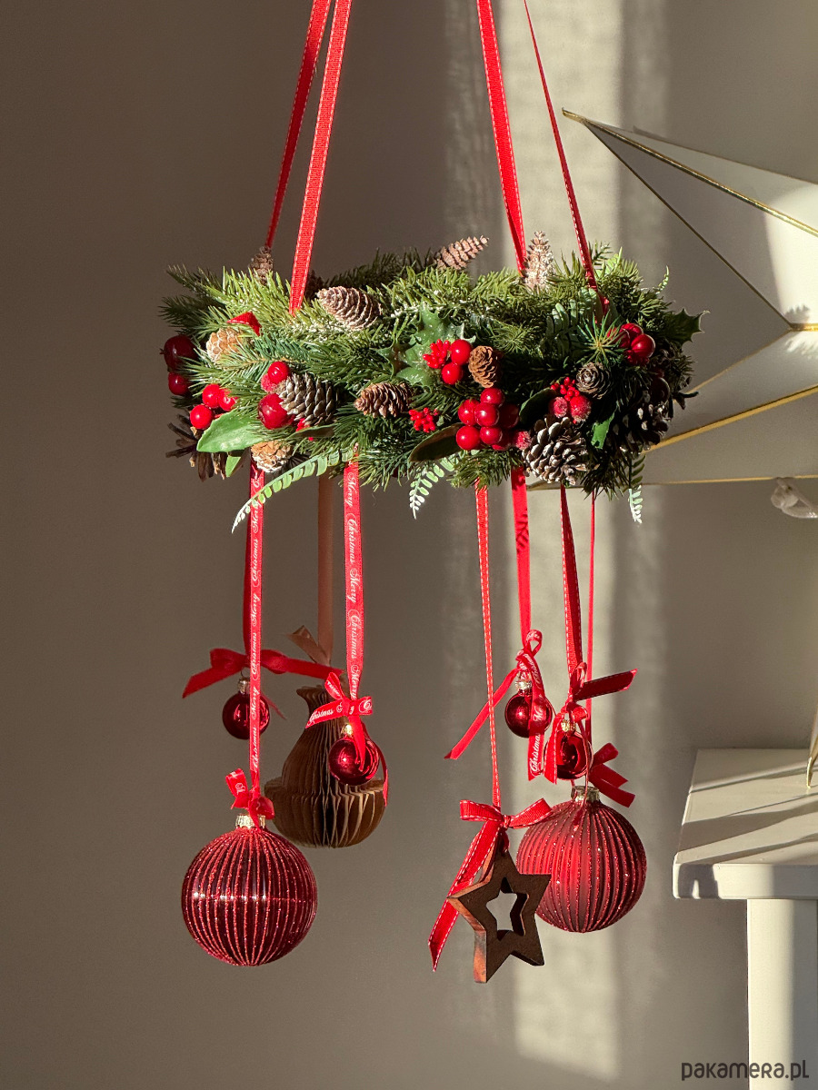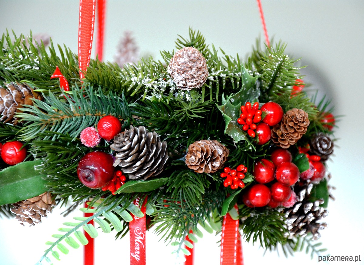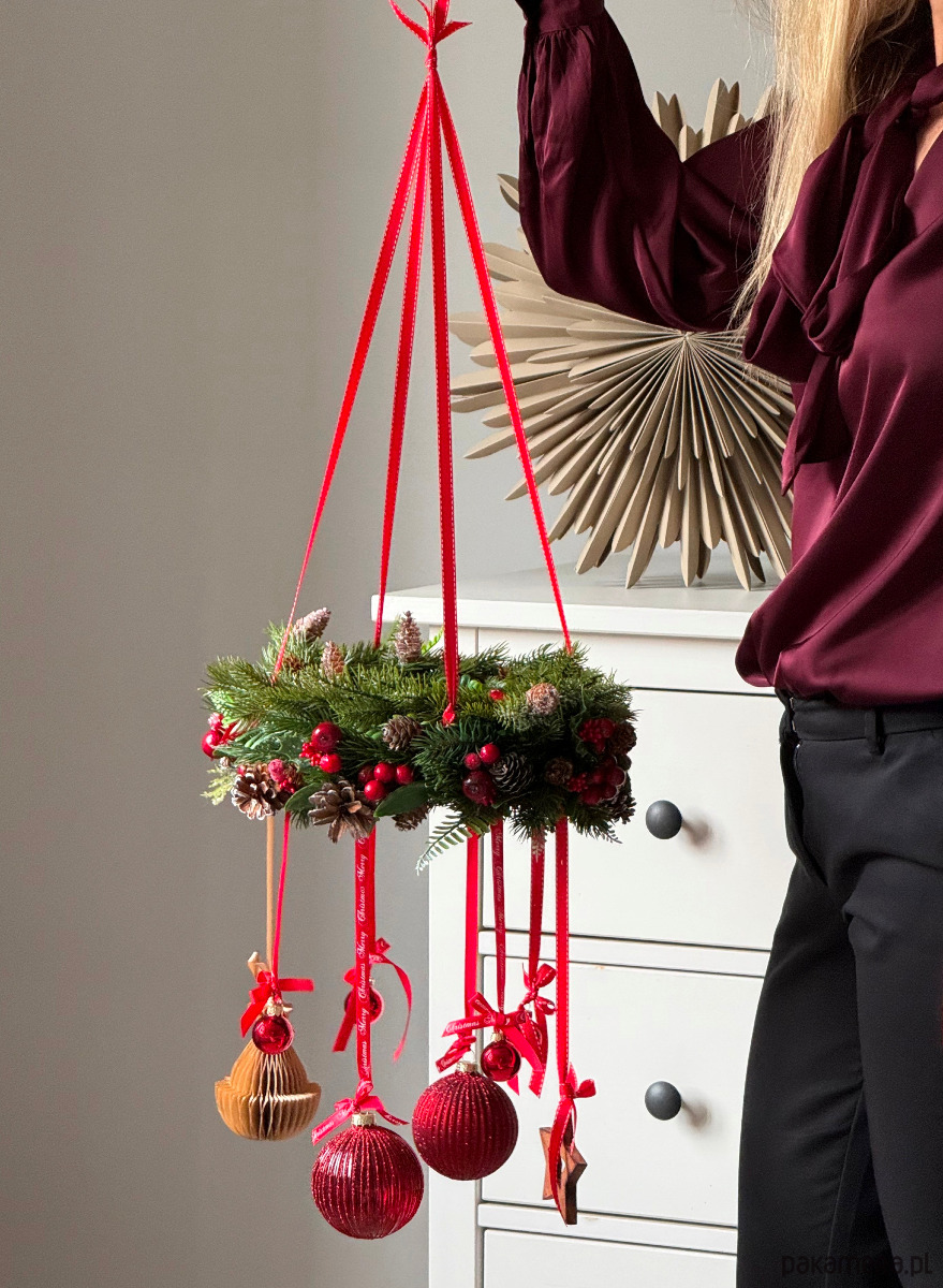 Świąteczny wieniec wiszący w odcieniach czerwieni i zieleni, z mnóstwem zimowych dodatków i ozdobnych wstążek. Magiczna dekoracja na Boże Narodzenie, do powieszenia nad stół, okno lub każdy inny kątek.