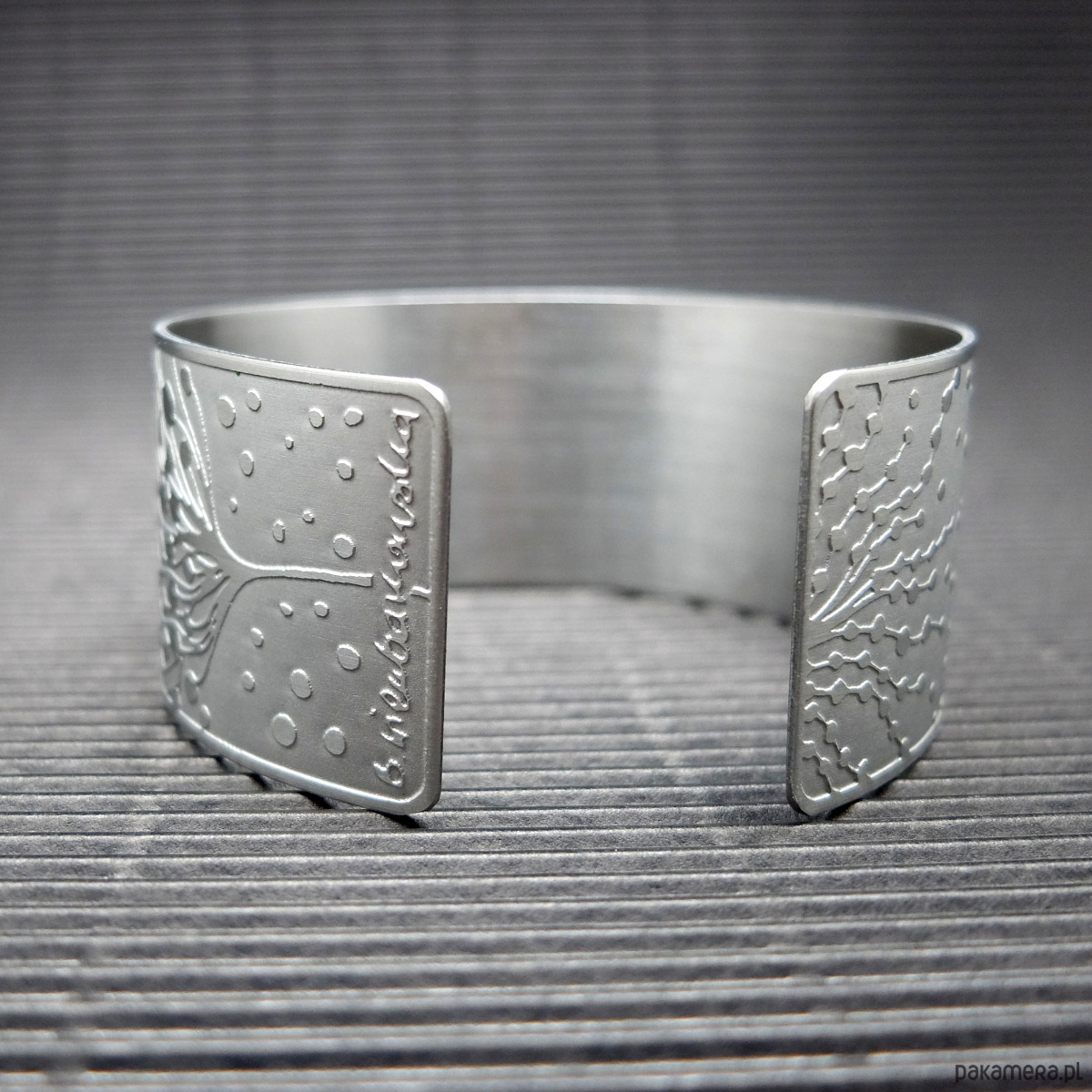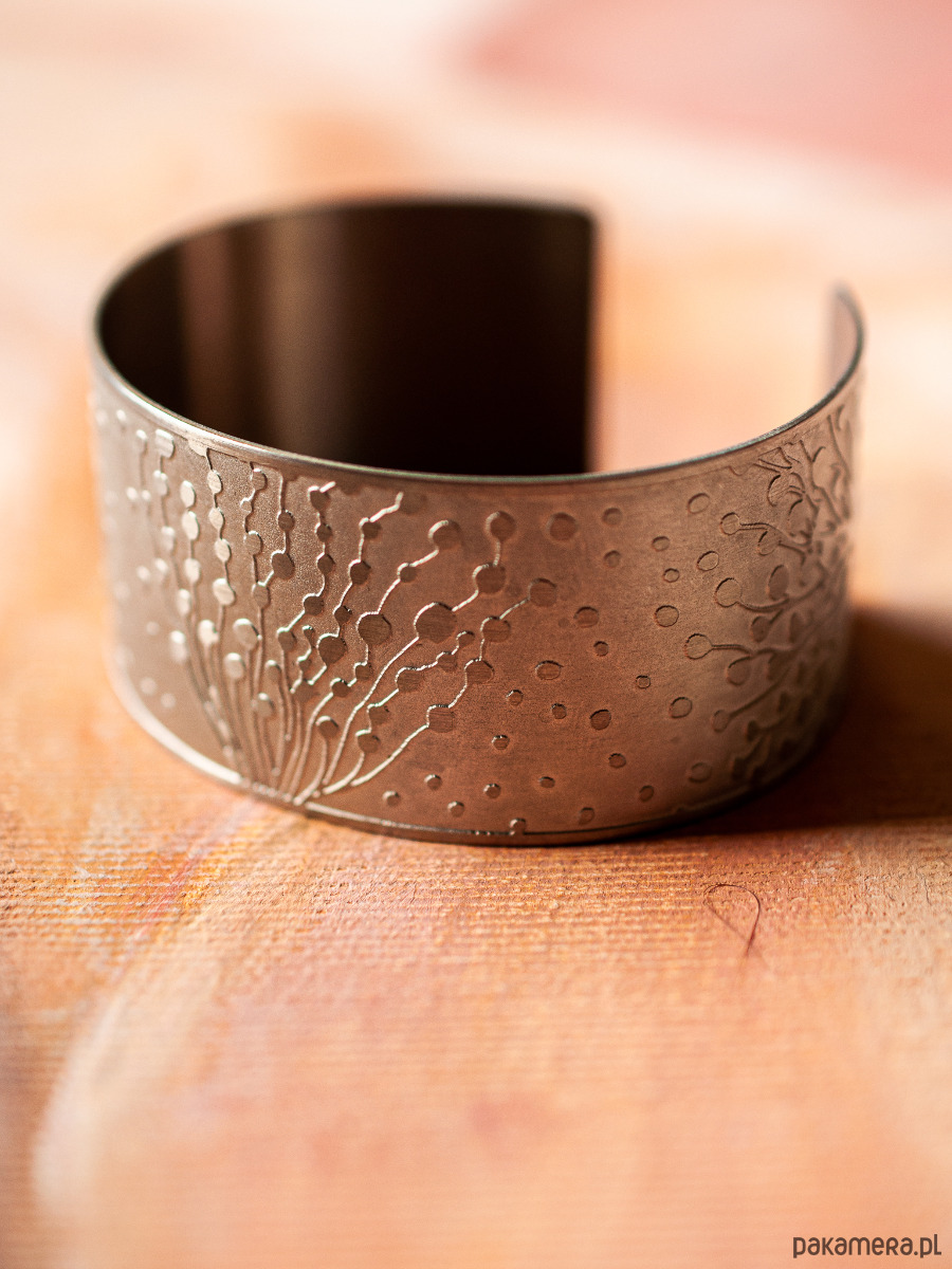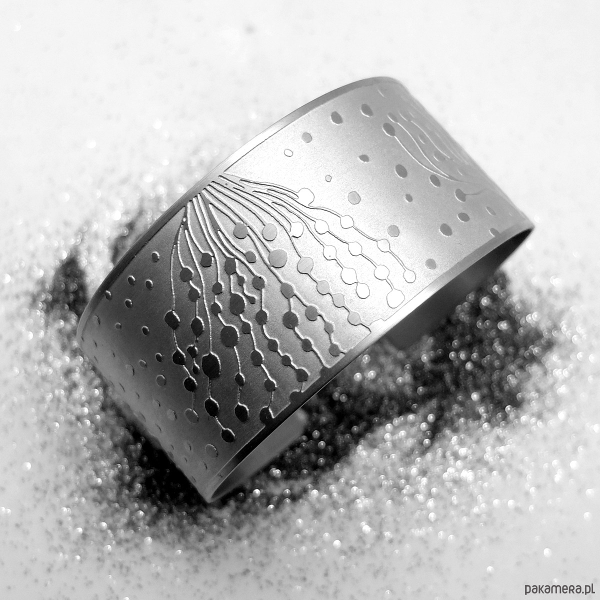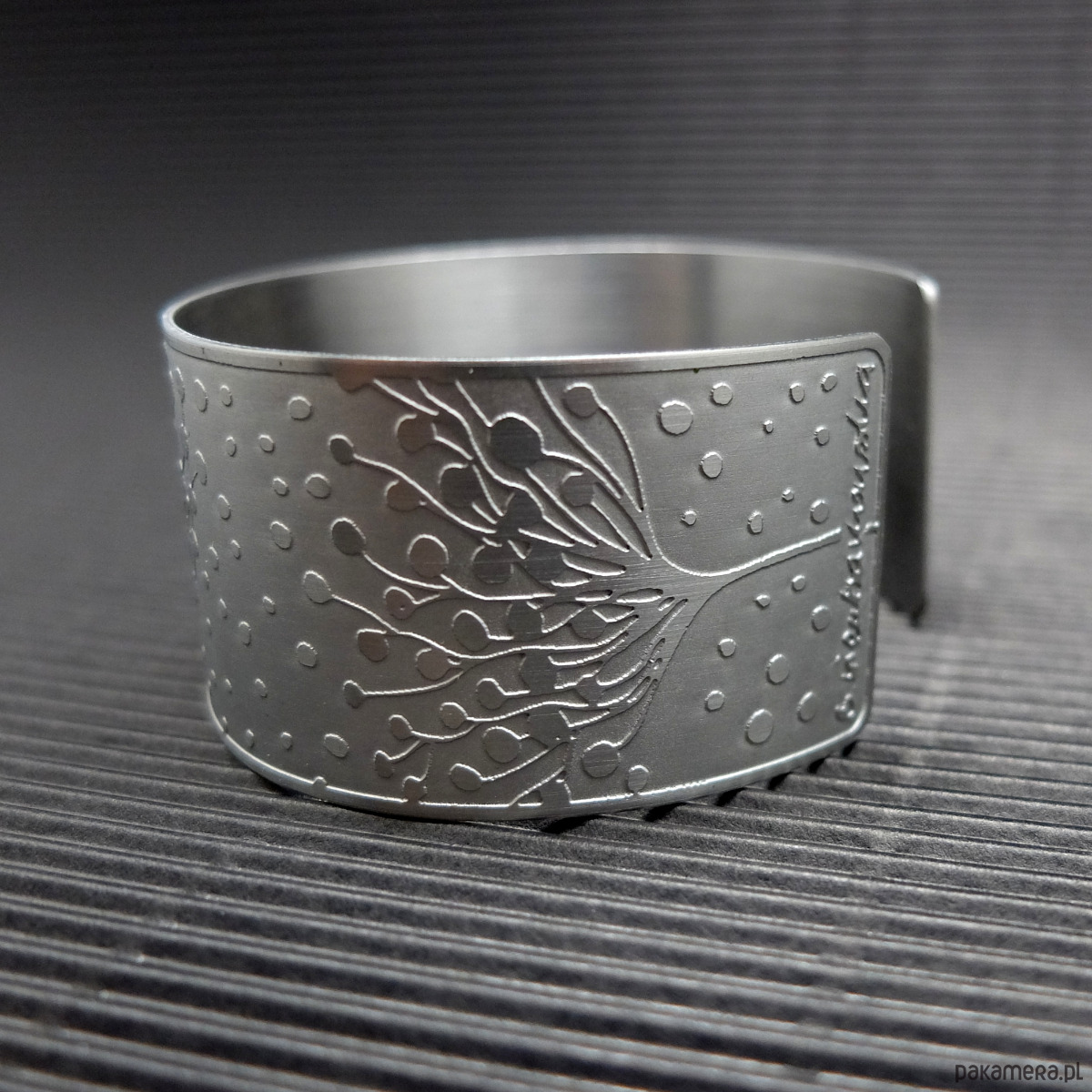 Unikatowa szeroka bransoleta ze stali szlachetnej z trwale naniesionym autorskim wzorem. Bransoleta ma 3,5 cm szerokości. Jest otwarta, dopasuje się do prawie każdego nadgarstka. Ze względu na wykorzystywaną technologię każdy wyrób ma inny unikatowy charakter, fakturę i wzór.