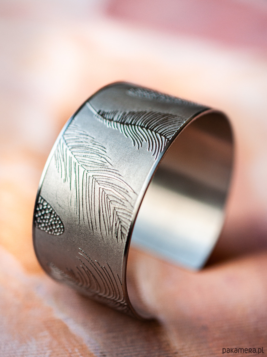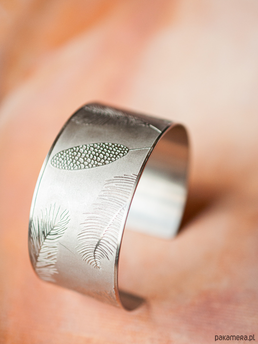 Unikatowa szeroka bransoleta ze stali szlachetnej z trwale naniesionym autorskim wzorem. Bransoleta ma 3,5 cm szerokości. Jest otwarta, dopasuje się do prawie każdego nadgarstka. Ze względu na wykorzystywaną technologię każdy wyrób ma inny unikatowy charakter, fakturę i wzór.