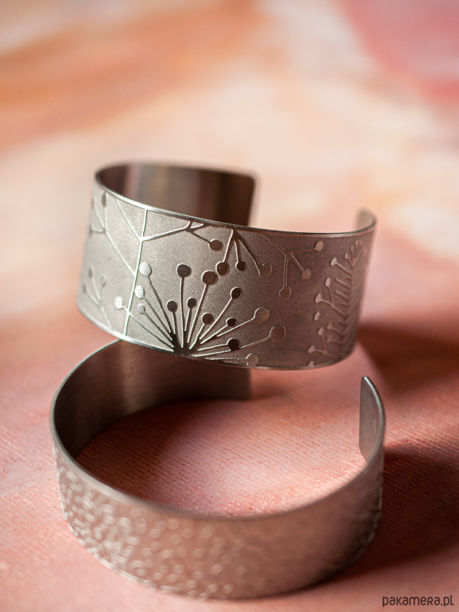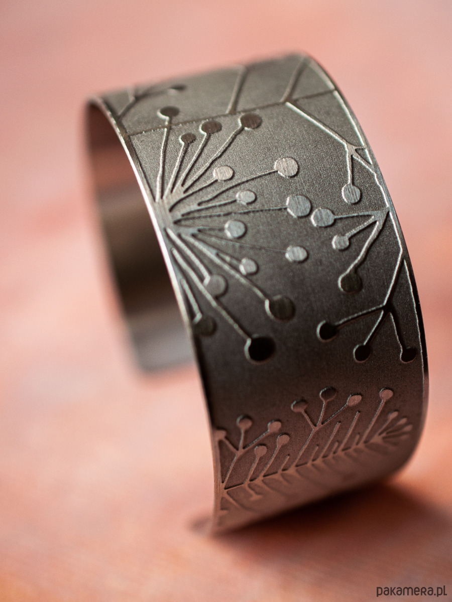 Unikatowa szeroka bransoleta ze stali szlachetnej z trwale naniesionym autorskim wzorem. Bransoleta ma 3,5 cm szerokości. Jest otwarta, dopasuje się do prawie każdego nadgarstka. Ze względu na wykorzystywaną technologię każdy wyrób ma inny unikatowy charakter, fakturę i wzór.