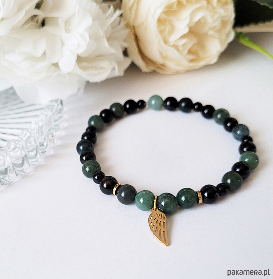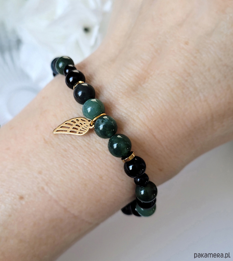 Śliczna bransoletka zrobiona z kamieni naturalnych: Agatu mszystego, Onyksu oraz Hematytu w kolorze złota.