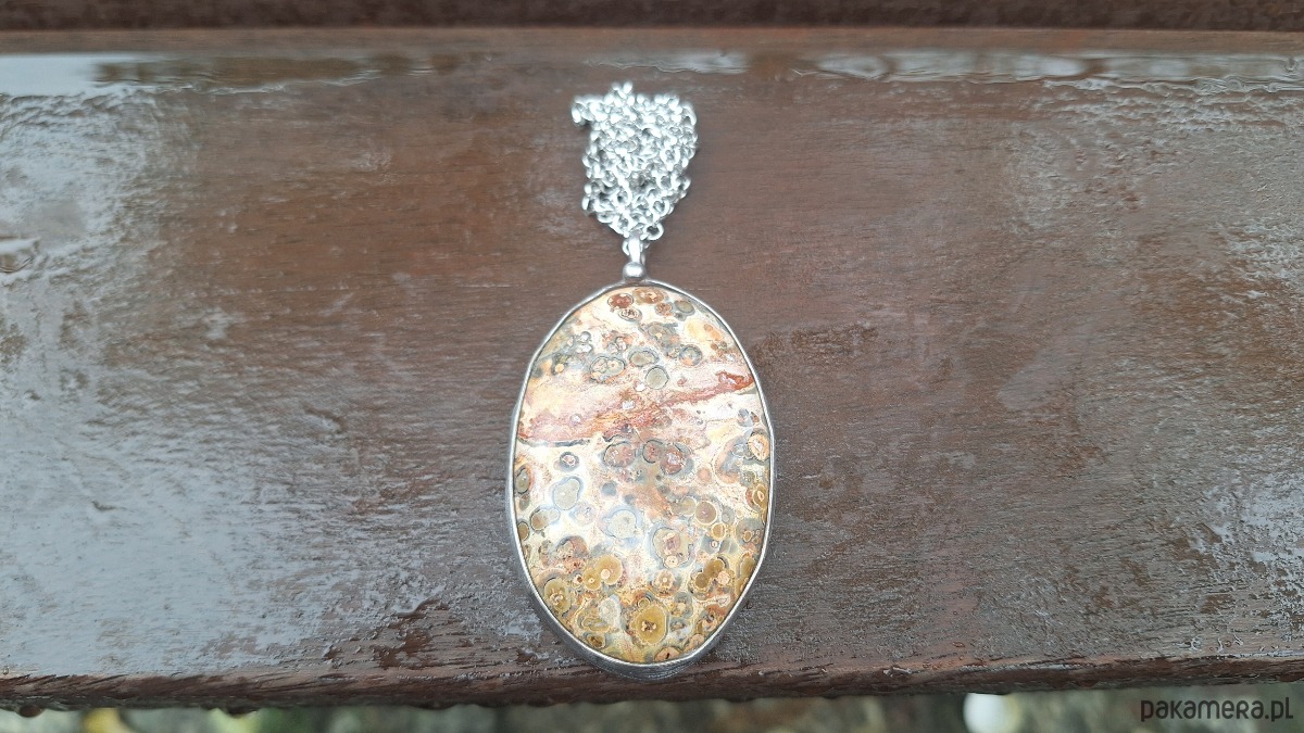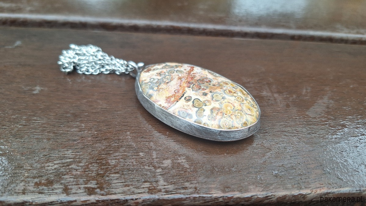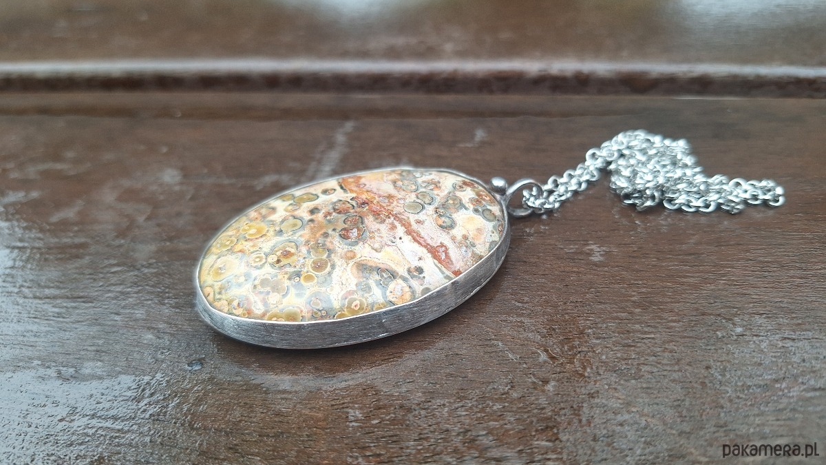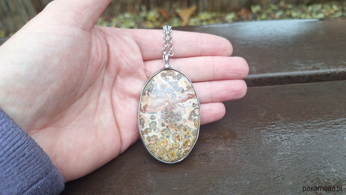 Wisiorek wykonany z miedzi, cyny i jaspisu. Wymiary ok. 6 na 4 cm. Zawieszony na łańcuszku o długości ok. 50 cm.