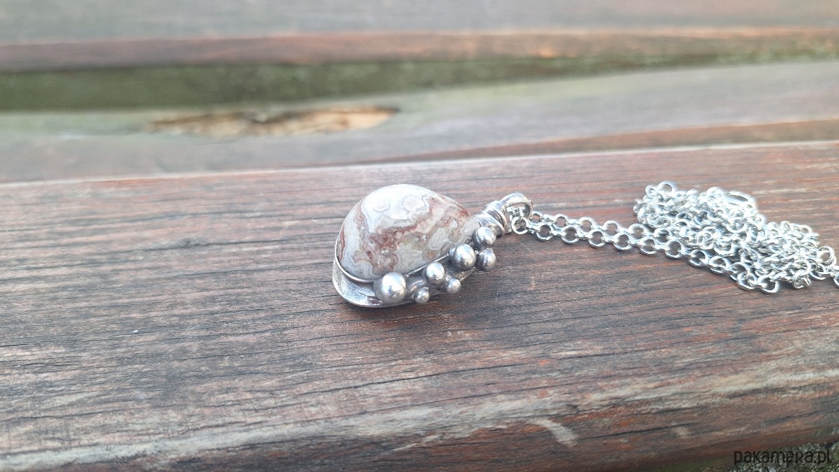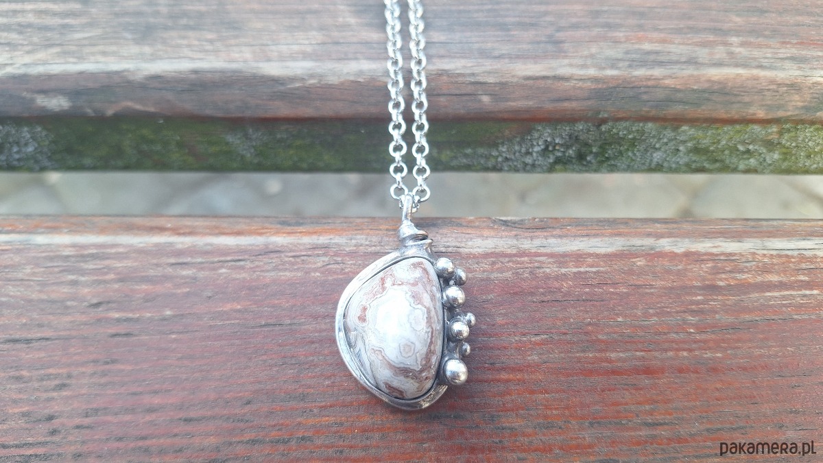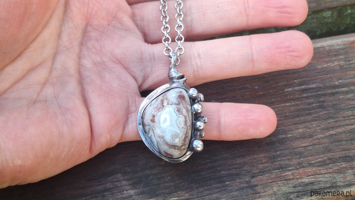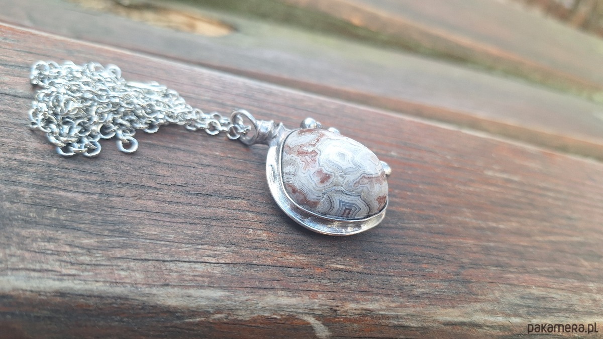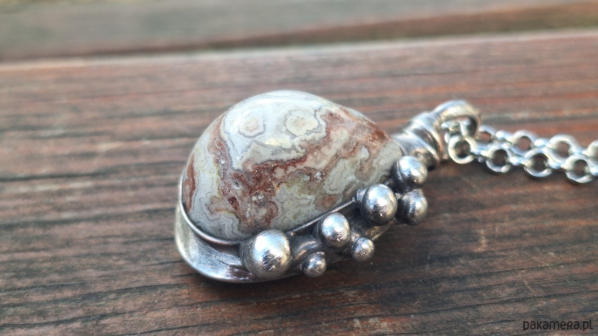 Wisiorek wykonany z miedzi, cyny i agatu. Wymiary ok. 3 na 2.3 cm. Zawieszony na łańcuszku o długości ok. 50 cm.