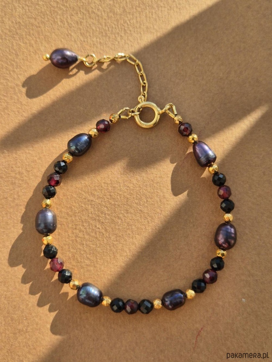 Ta wzorzysta, misternie wykonana bransoletka inspirowana jest orientalnymi tkaninami – bogatymi w kolor, światło i symboliczne znaczenia. W jej barwach odnaleźć można echo haftowanych złotem szat i jedwabnych dywanów: zmysłowy połysk czarnych pereł, intensywny blask granatów, wielobarwne refleksy turmalinów oraz ciepłe akcenty złotych hematytów tworzą kompozycję pełną elegancji i harmonii.