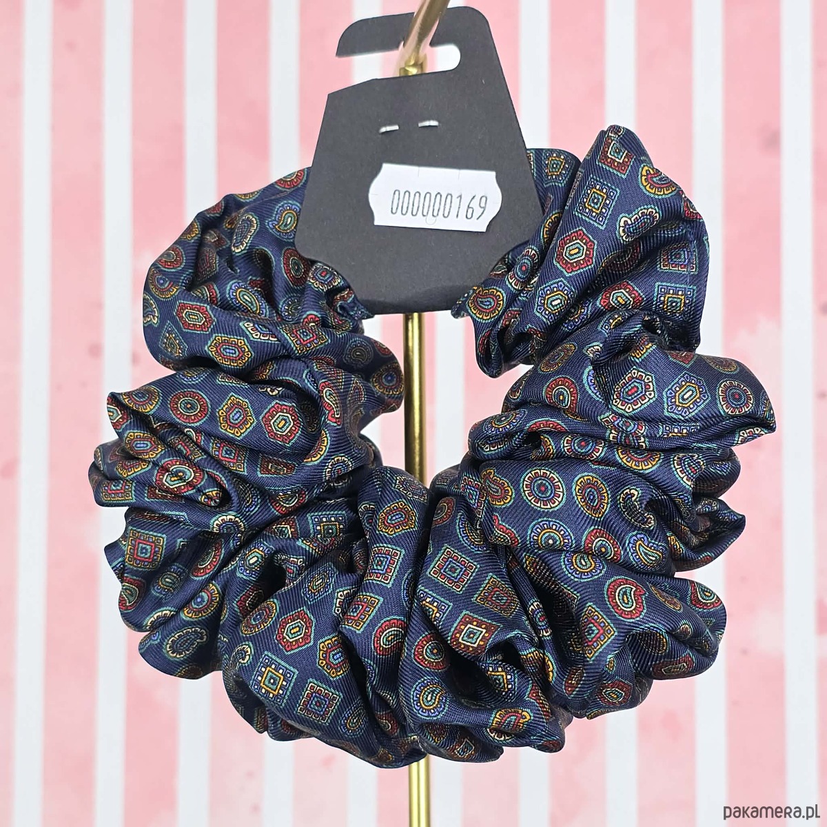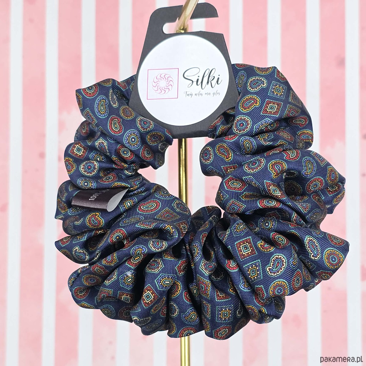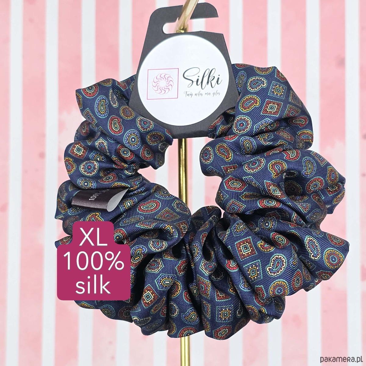 XL duża gumka do włosów jedwab naturalny scrunchie granatowa wzór