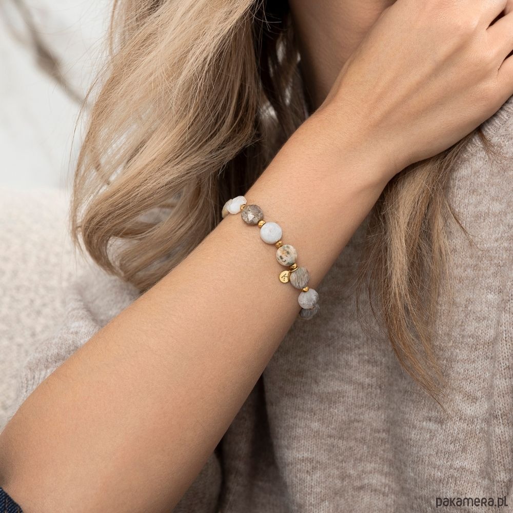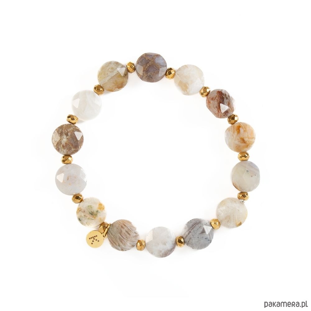 Ta bransoletka została wykonana z Kwarcu Lodolitu i Hematytu – kamieni, które wspólnie tworzą harmonijne połączenie natury, spokoju i elegancji. Riolit to kamień transformacji i wewnętrznej równowagi. Pomaga wprowadzać pozytywne zmiany, rozwija odwagę i wspiera w realizacji marzeń. Jego naturalne, ziemiste barwy symbolizują stabilność i kontakt z naturą. Hematyt, dostępny w wersji złotej lub srebrnej, wzmacnia siłę, koncentrację i pewność siebie, dodając biżuterii subtelnego blasku i nowoczesnego charakteru.