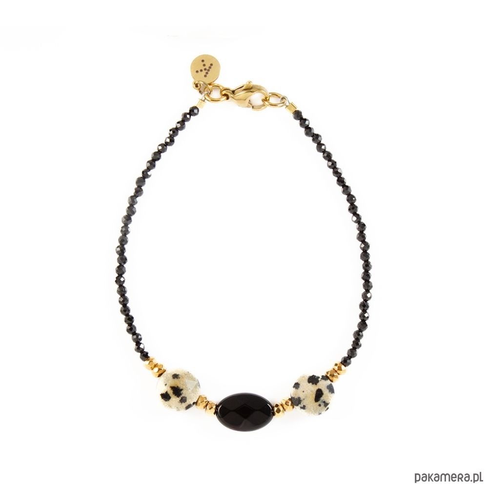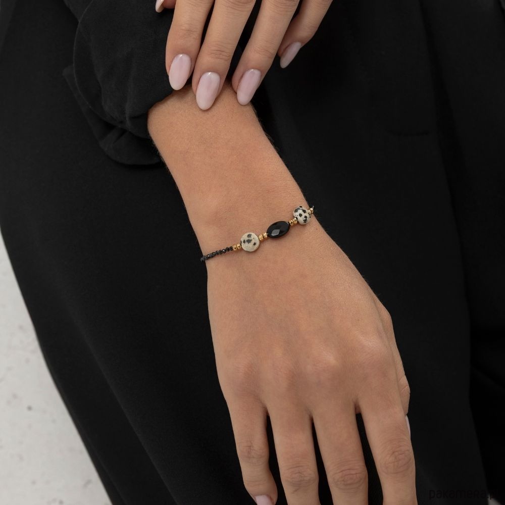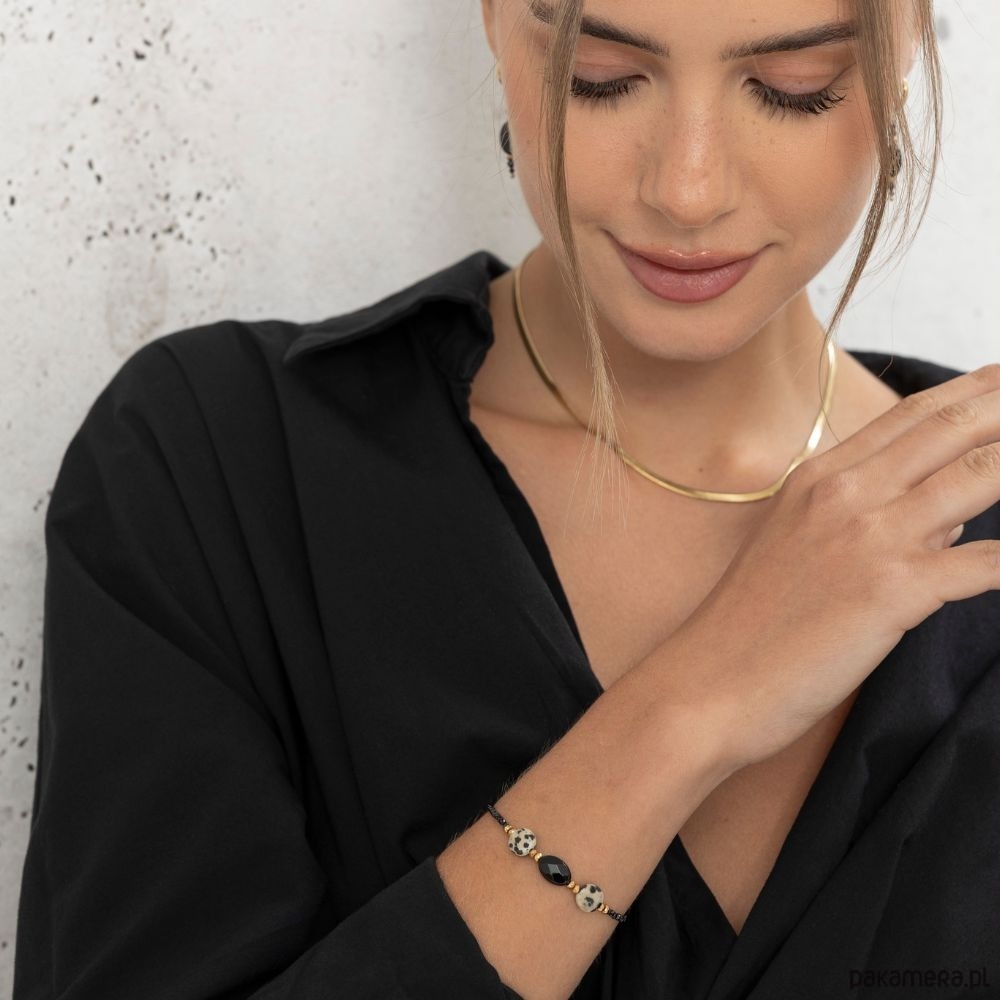 Ta bransoletka to eleganckie połączenie naturalnych kamieni — Onyksu, Kamienia Dalmatyńskiego, Spinelu oraz Hematytu w wersji złotej lub srebrnej. To biżuteria, która łączy w sobie ochronę, równowagę i radość życia, tworząc subtelny, ale pełen mocy talizman. Centralne miejsce zajmuje Onyks – kamień siły i pewności siebie, który pomaga zachować spokój i chroni przed negatywną energią. Obok niego znajduje się Kamień Dalmatyński, symbol szczęścia, spontaniczności i lekkości, który przypomina o radości płynącej z codziennych chwil. Spinel dodaje energii, odwagi i wewnętrznego blasku, a Hematyt, dostępny w wykończeniu złotym lub srebrnym, stabilizuje emocje i wzmacnia poczucie harmonii. To bransoletka, która nie tylko zdobi, ale także wspiera — idealna dla osób poszukujących połączenia elegancji, pozytywnej energii i siły w jednym dodatku.