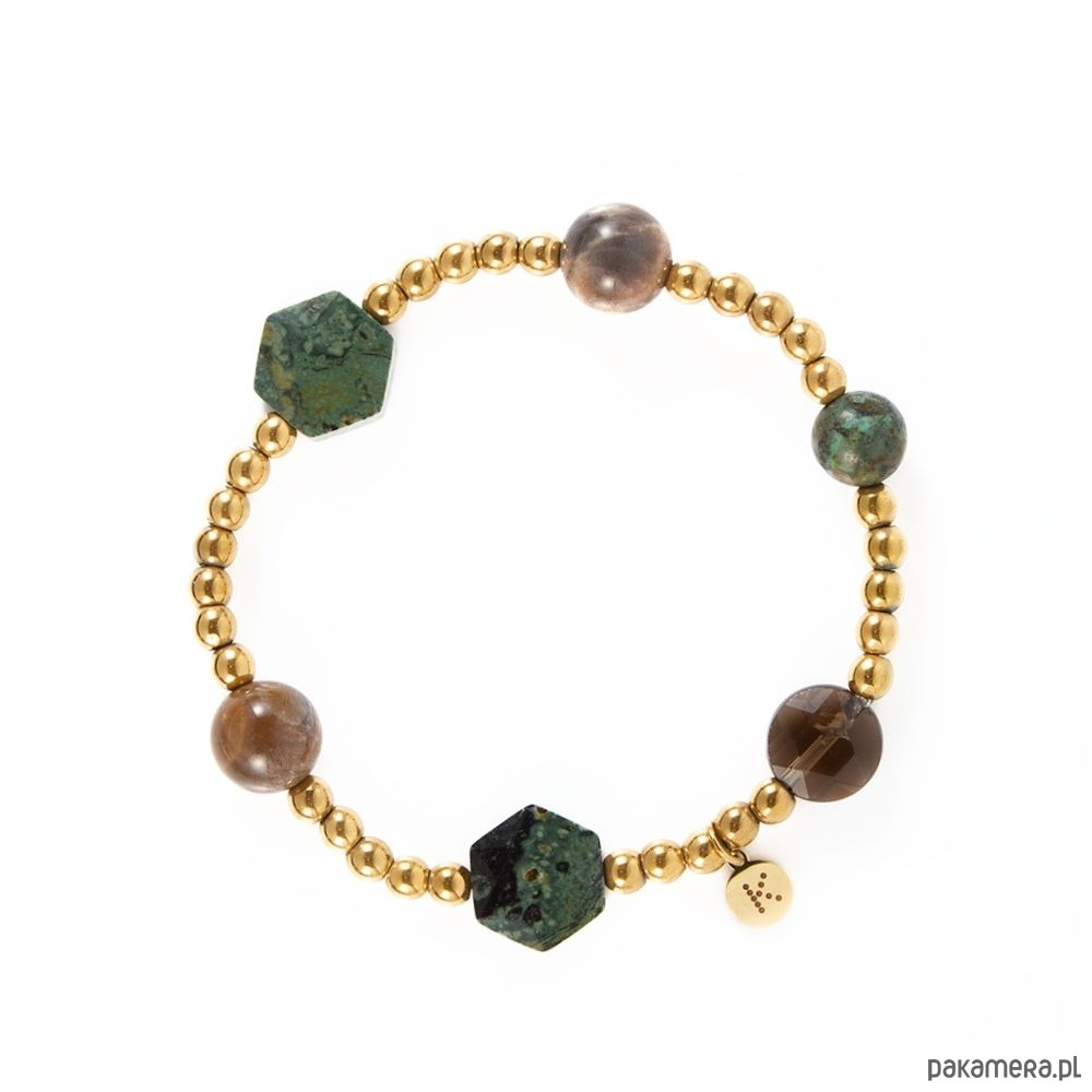 Towarzyszą mu Turkus Afrykański, kamień odwagi i przemiany, Kamień Słoneczny emanujący ciepłem i optymizmem oraz Kwarc Dymny, który wprowadza spokój i chroni przed negatywną energią. Całość dopełniają pozłacane Hematyty, które dodają bransoletce elegancji i nowoczesnego blasku.