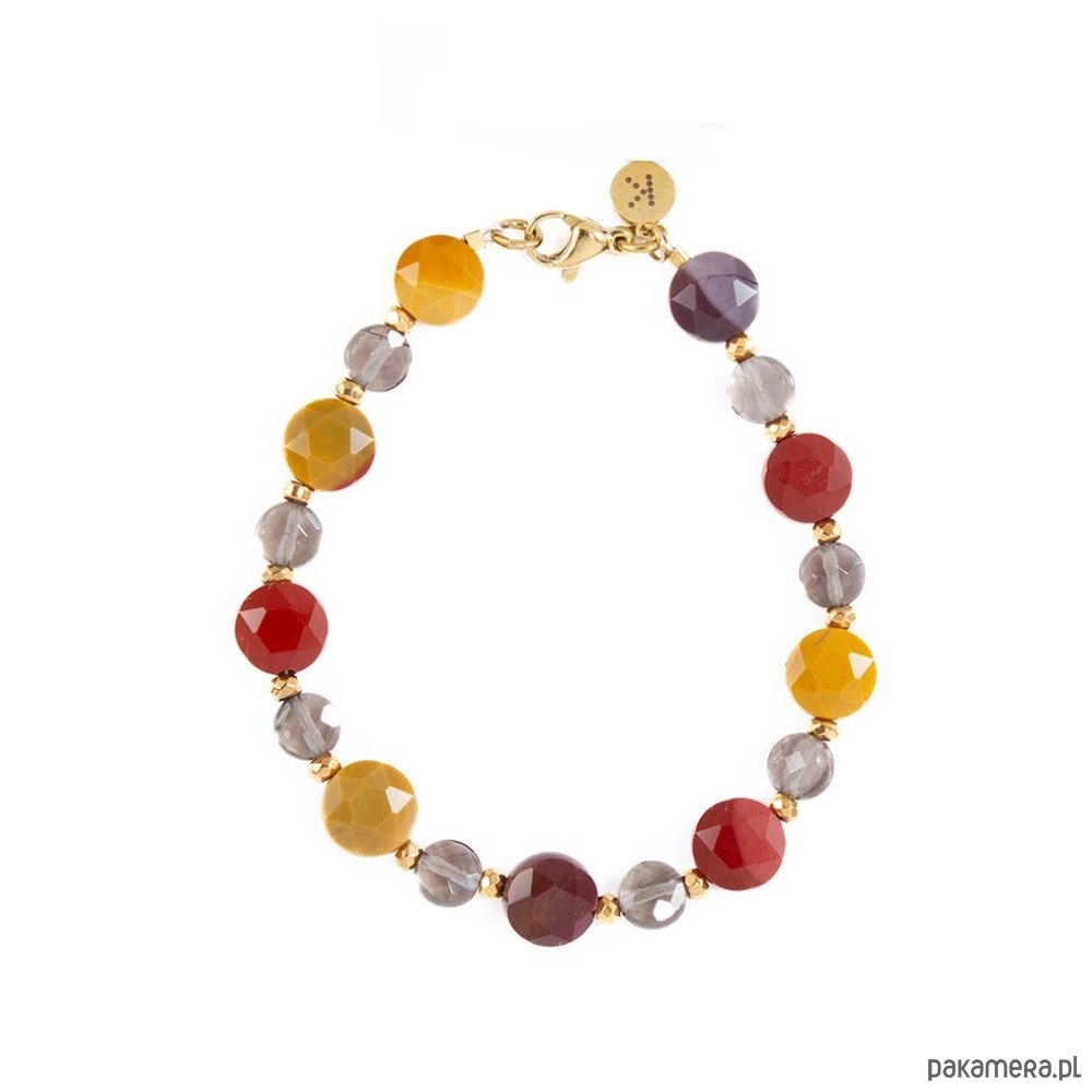Ta bransoletka to połączenie ciepła ziemi i subtelnej elegancji. Mookait zachwyca swoimi barwami – od ognistych czerwieni, przez nasycone bordo, aż po złociste odcienie. Uznawany jest za kamień odwagi i energii, który inspiruje do działania i dodaje pewności siebie.Obok niego pojawia się Kwarc Dymny, kamień równowagi i wyciszenia. Jego przejrzyste, dymne barwy wprowadzają spokój i harmonię, równoważąc dynamiczną energię Mokaitu.