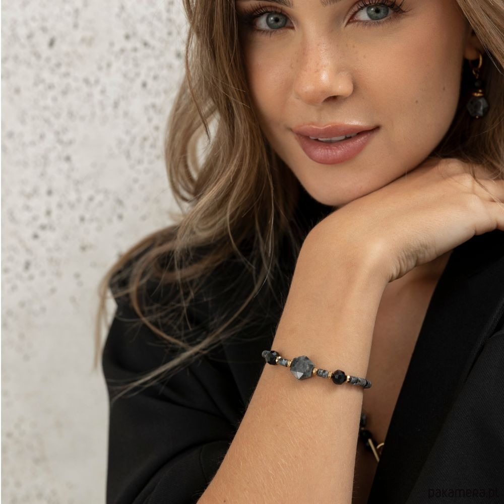 Po bokach znajdują się fasetowane kamienie Czarnego Turmalinu, minerału ochronnego, który wzmacnia poczucie bezpieczeństwa i równowagi. Całość dopełnia Hematyt – dostępny w dwóch wariantach: złotym lub srebrnym. To kamień stabilizacji i siły, który wprowadza elegancję i nowoczesny charakter.
