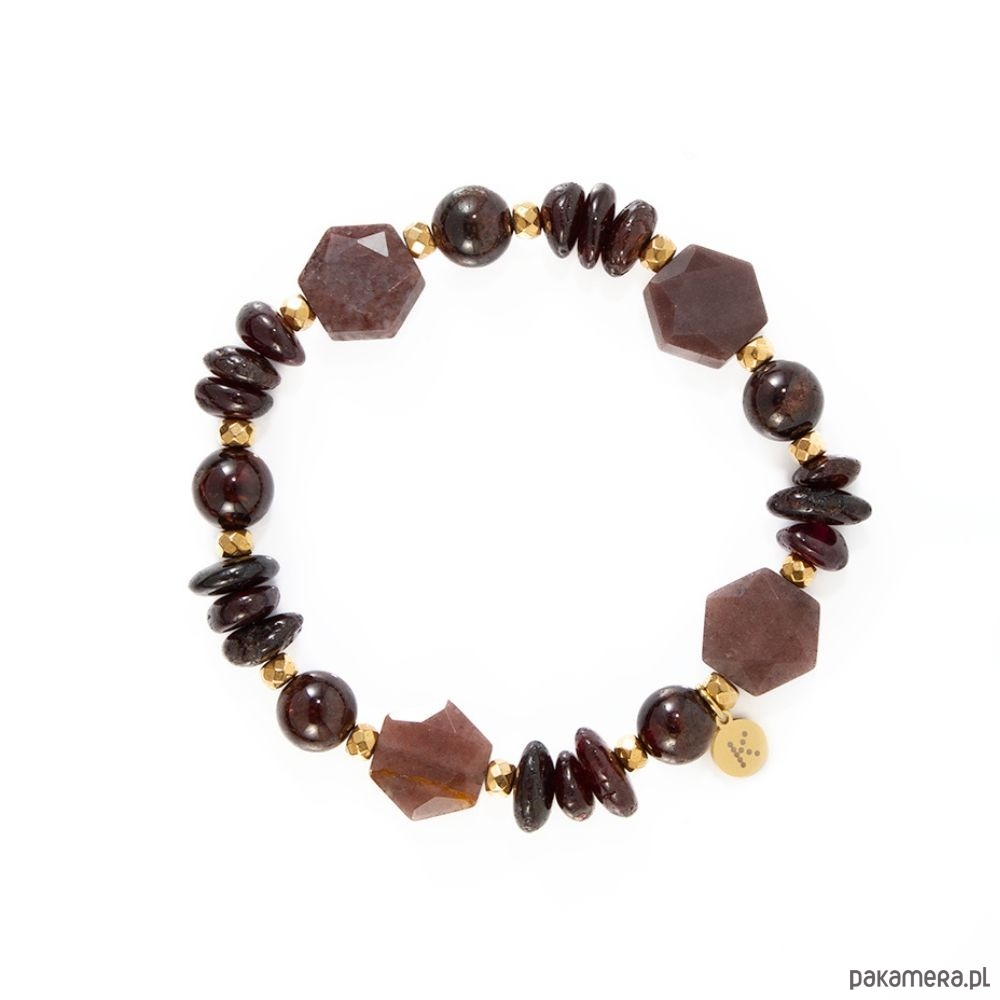 Wyjątkowa bransoletka, która łączy głębię barw i moc naturalnych minerałów. Jej sercem są kamienie Granatu, których nasycona czerwień symbolizuje siłę życiową, odwagę i pasję. Granat od dawna uważany jest za kamień energii i determinacji – wspiera w realizacji celów i wzmacnia wewnętrzny ogień. Obok niego pojawia się Awenturyn w postaci geometrycznych heksagonów. To kamień harmonii i równowagi, który uspokaja emocje, pomaga zachować spokój i przyciąga pozytywną energię. Jego naturalne, ziemiste tony tworzą eleganckie połączenie z intensywną czerwienią Granatu, nadając bransoletce subtelny, ale wyrazisty charakter. Całość uzupełniają detale z Hematytu, dostępnego w wersji złotej lub srebrnej. Hematyt to kamień stabilności i ochrony – dodaje pewności siebie, wzmacnia koncentrację i podkreśla nowoczesny styl biżuterii. Elastyczna forma sprawia, że bransoletka idealnie dopasowuje się do nadgarstka, łącząc komfort noszenia z wyjątkowym znaczeniem. To talizman pasji, harmonii i siły, który dodaje energii i równowagi każdego dnia. Znaczenie kamieni:Awenturyn to kamień nowych możliwości. Awenturyn pobudza umysł do myślenia poza schematami i zachęca do działania. Jest on jak magiczny klucz otwierający drzwi do nowych możliwości i pomysłów. To co w jednym momencie wydawało się niemożliwe, staje się możliwe, gdy Awenturyn znajduje się blisko.Hematyt to kamień wojowników. Silnie oczyszcza krew. Budzi radość do życia, dodaje odwagi i wiary we własne umiejętności. Granat to kamień kreatywności. Jest to kamień tworzenia i rozpoczynania czegoś nowego. Wpływa na wiarę w siebie i dążenie do celów. Każda bransoletka różni się nieco od siebie, ponieważ nie ma dwóch takich samych kamieni. Dla klienta wybieramy kamienie z wielką starannością, zawsze intuicyjnie.