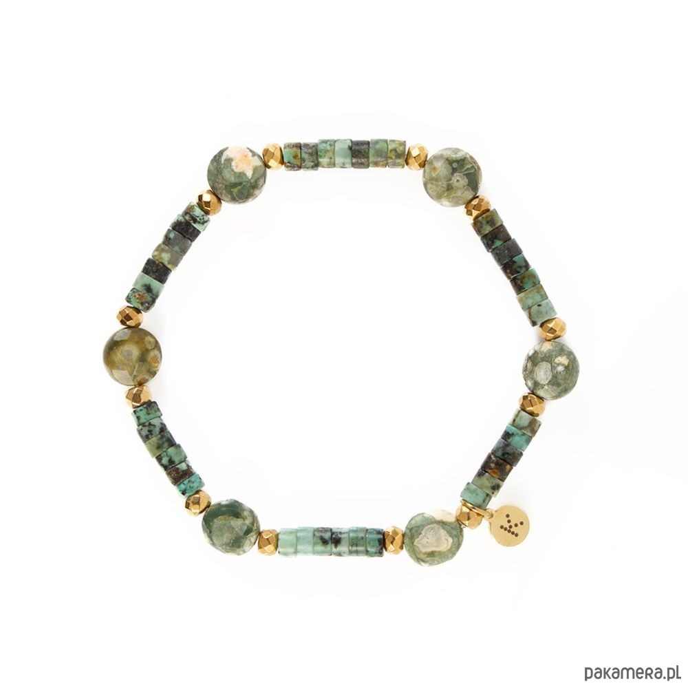 Ta bransoletka to połączenie trzech naturalnych kamieni o wyjątkowej energii – Riolitu, Turkusu Afrykańskiego i Hematytu. Ich naturalne, ziemiste odcienie zieleni i złota tworzą harmonijną kompozycję, która symbolizuje spokój, siłę i równowagę. Riolit to kamień wewnętrznej przemiany i harmonii. Pomaga przechodzić przez życiowe zmiany z odwagą i spokojem, wspierając rozwój osobisty i akceptację siebie. Jego naturalne barwy przywodzą na myśl krajobrazy natury, wprowadzając równowagę i ukojenie. Turkus Afrykański symbolizuje odrodzenie i nowe początki. To kamień pozytywnej energii, który pomaga odzyskać spokój, wzmacnia intuicję i przyciąga dobre wibracje. Wspiera emocjonalną równowagę i harmonię z naturą. Hematyt to kamień siły i odwagi. Stabilizuje emocje, wzmacnia poczucie bezpieczeństwa i ugruntowuje energię, dodając przy tym elegancji dzięki swojemu subtelnemu, metalicznemu połyskowi. Każda bransoletka wykonywana jest ręcznie z naturalnych kamieni, dzięki czemu każdy egzemplarz jest niepowtarzalny – tak jak energia osoby, która ją nosi. Znaczenie kamieni: Turkus afrykański to kamień podróżników. Pełen energii talizman, wzmacniający odwagę i intuicję podróżujących oraz sprzyjający nowym przyjaźniom. Hematyt to kamień wojowników. Silnie oczyszcza krew. Budzi radość do życia, dodaje odwagi i wiary we własne umiejętności. Riolit to kamień wewnętrznej przemiany i równowagi. Pomaga przejść przez życiowe zmiany z odwagą i spokojem, wspierając proces głębokiej transformacji. Uczy akceptacji siebie i otwiera na rozwój osobisty, dzięki czemu uznawany jest za minerał odnowy i harmonii. Każda bransoletka różni się nieco od siebie, ponieważ nie ma dwóch takich samych kamieni. Dla klienta wybieramy kamienie z wielką starannością, zawsze intuicyjnie.