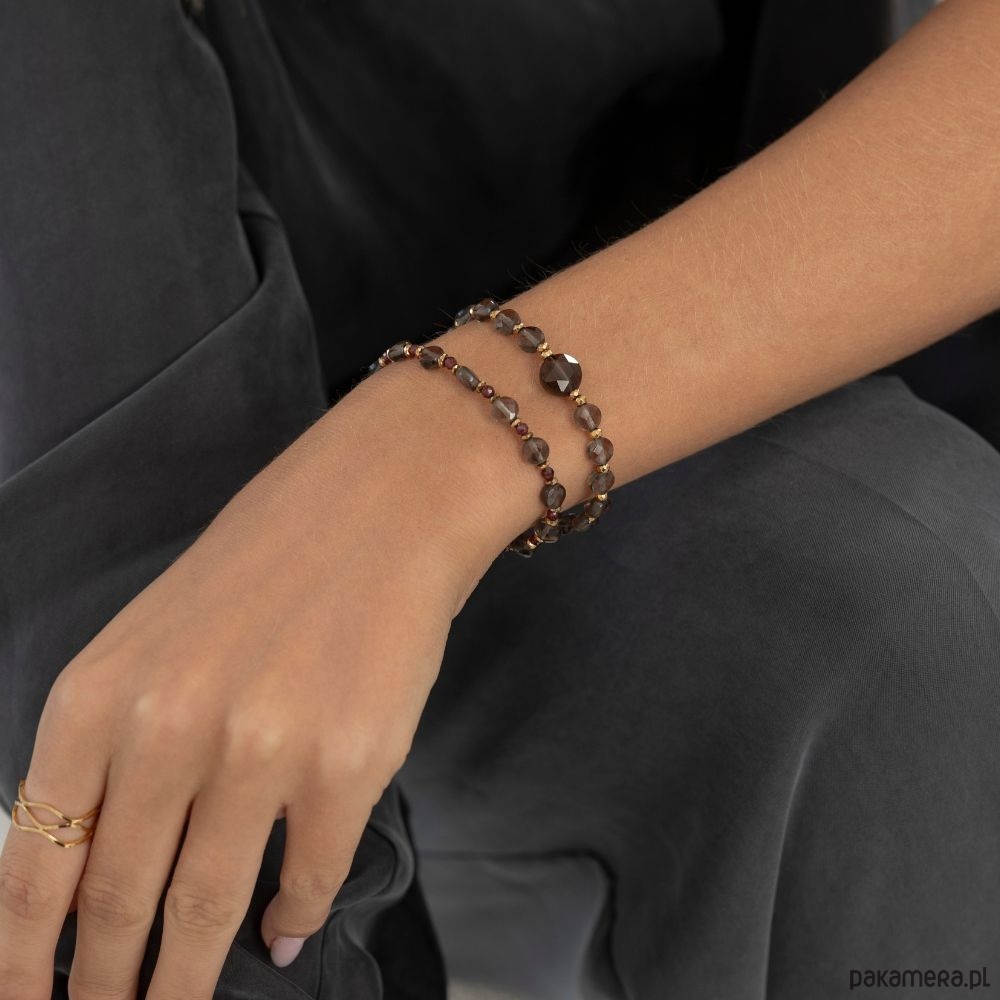 Kwarc Dymny to kamień uziemienia i spokoju. Pomaga pozbyć się napięcia, wprowadza harmonię i pozwala zachować jasność myśli w trudnych chwilach. Wspiera regenerację i sprzyja emocjonalnej stabilności. Hematyt, dostępny w wersji złotej lub srebrnej, dodaje bransoletce wyrafinowanego połysku i siły. Wzmacnia pewność siebie, stabilizuje energię i wspiera koncentrację.