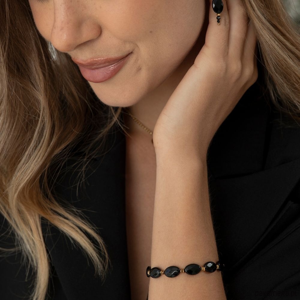Onyks reprezentuje odwagę, wytrwałość i ochronę. Jest niczym tarcza, która pomaga zachować spokój i siłę w codziennym życiu. Jego czarna, lustrzana powierzchnia pochłania negatywną energię, pozostawiając przestrzeń na równowagę i wewnętrzną harmonię. To kamień pewności siebie, który przypomina, że każda kobieta ma w sobie siłę, by świecić nawet w najciemniejszy dzień.