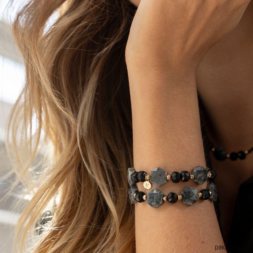 Elegancka bransoletka wykonana z naturalnych kamieni: Labradorytu, Onyksu i Hematytu. To połączenie tworzy wyjątkowy talizman siły, ochrony i harmonii. Labradoryt w unikatowym, geometrycznym szlifie zachwyca subtelnym, migoczącym blaskiem. Nazywany kamieniem intuicji i przemiany – wzmacnia wewnętrzną moc, otwiera na nowe możliwości i chroni przed negatywną energią. Onyks w głębokiej czerni symbolizuje stabilność i pewność siebie. To kamień, który dodaje odwagi, pomaga podejmować decyzje i wspiera w chwilach wyzwań. Całość dopełnia Hematyt, dostępny w wersji złotej lub srebrnej. Hematyt wprowadza równowagę, wzmacnia koncentrację i nadaje biżuterii eleganckiego charakteru. Ta bransoletka to nie tylko stylowy dodatek, ale także osobisty talizman – idealna propozycja dla osób, które chcą podkreślić swój charakter i jednocześnie otaczać się energią ochrony i stabilizacji.