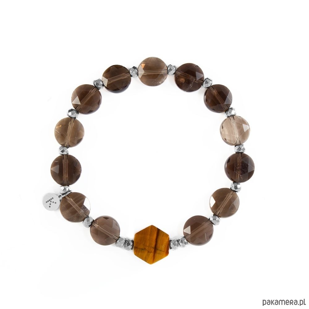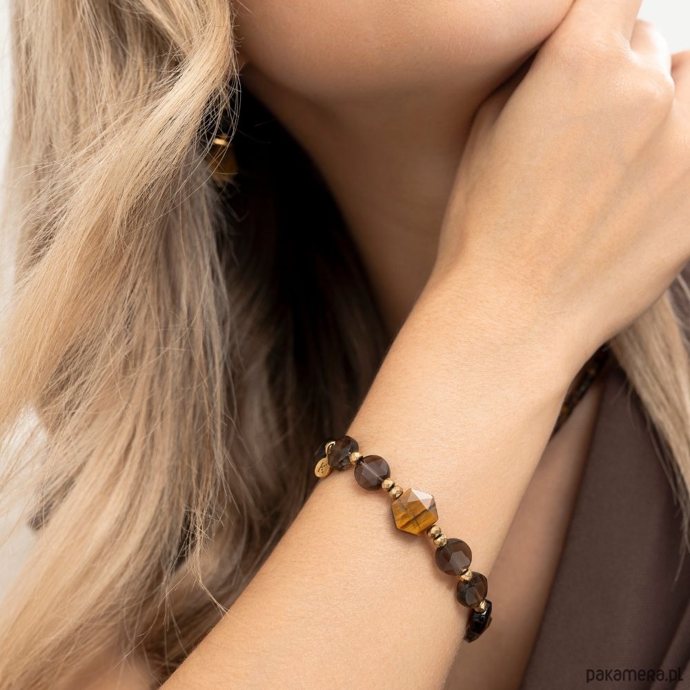 Bransoletka wykonana z naturalnych kamieni – kwarcu Dymnego, Tygrysiego Oka oraz Hematytu – to biżuteria, która łączy elegancję z głęboką symboliką minerałów. Kwarc dymny w odcieniach brązu sprzyja wyciszeniu i wewnętrznej równowadze, pomagając uwolnić się od napięć dnia codziennego.Centralne Tygrysie oko emanuje energią odwagi i siły, a jego złociste refleksy nadają całości ciepły, przyciągający blask. Całość uzupełnia Hematyt, dostępny w dwóch wersjach – złotej i srebrnej. To kamień stabilizacji i pewności siebie, który podkreśla charakter bransoletki, nadając jej elegancki i nowoczesny wygląd. Bransoletka z Kwarcu dymnego, Tygrysiego oka i Hematytu to wyjątkowy dodatek, który sprawdzi się zarówno w codziennych stylizacjach, jak i przy szczególnych okazjach – łącząc w sobie piękno natury i talizmanową moc kamieni. Znaczenie kamieni: Kwarc dymny to kamień zmian. Szczególnie polecany dla osób, którym trudno jest dokonywać zmian w życiu w obawie przed nieznanym. Hematyt to kamień wojowników. Silnie oczyszcza krew. Budzi radość do życia, dodaje odwagi i wiary we własne umiejętności. Tygrysie oko to kamień odwagi. Dodaje odwagi w wyrażaniu własnego zdania, wzmacnia wolę przetrwania i dążenia do sukcesu. Każda bransoletka różni się nieco od siebie, ponieważ nie ma dwóch takich samych kamieni. Dla klienta wybieramy kamienie z wielką starannością, zawsze intuicyjnie.