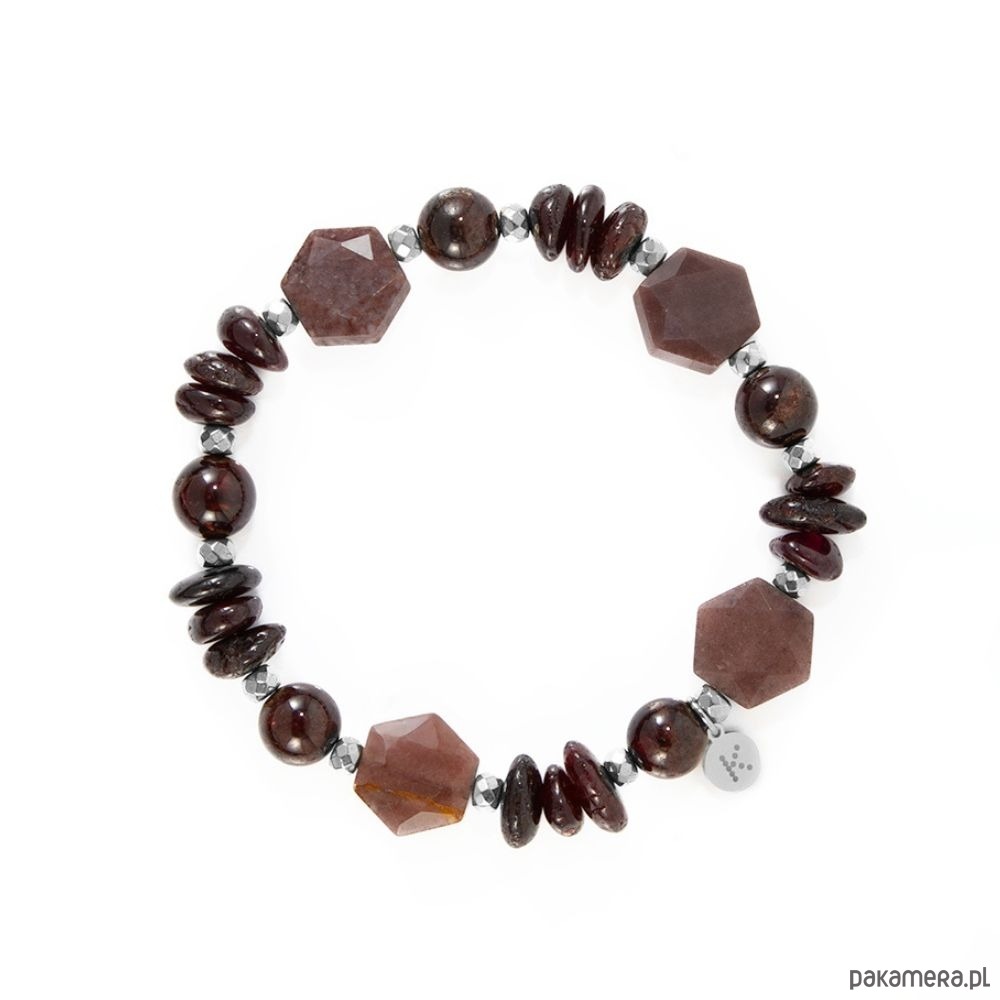 Wyjątkowa bransoletka, która łączy głębię barw i moc naturalnych minerałów. Jej sercem są kamienie Granatu, których nasycona czerwień symbolizuje siłę życiową, odwagę i pasję. Granat od dawna uważany jest za kamień energii i determinacji – wspiera w realizacji celów i wzmacnia wewnętrzny ogień. Obok niego pojawia się Awenturyn w postaci geometrycznych heksagonów. To kamień harmonii i równowagi, który uspokaja emocje, pomaga zachować spokój i przyciąga pozytywną energię. Jego naturalne, ziemiste tony tworzą eleganckie połączenie z intensywną czerwienią Granatu, nadając bransoletce subtelny, ale wyrazisty charakter. Całość uzupełniają detale z Hematytu, dostępnego w wersji złotej lub srebrnej. Hematyt to kamień stabilności i ochrony – dodaje pewności siebie, wzmacnia koncentrację i podkreśla nowoczesny styl biżuterii. Elastyczna forma sprawia, że bransoletka idealnie dopasowuje się do nadgarstka, łącząc komfort noszenia z wyjątkowym znaczeniem. To talizman pasji, harmonii i siły, który dodaje energii i równowagi każdego dnia. Znaczenie kamieni:Awenturyn to kamień nowych możliwości. Awenturyn pobudza umysł do myślenia poza schematami i zachęca do działania. Jest on jak magiczny klucz otwierający drzwi do nowych możliwości i pomysłów. To co w jednym momencie wydawało się niemożliwe, staje się możliwe, gdy Awenturyn znajduje się blisko.Hematyt to kamień wojowników. Silnie oczyszcza krew. Budzi radość do życia, dodaje odwagi i wiary we własne umiejętności. Granat to kamień kreatywności. Jest to kamień tworzenia i rozpoczynania czegoś nowego. Wpływa na wiarę w siebie i dążenie do celów. Każda bransoletka różni się nieco od siebie, ponieważ nie ma dwóch takich samych kamieni. Dla klienta wybieramy kamienie z wielką starannością, zawsze intuicyjnie.