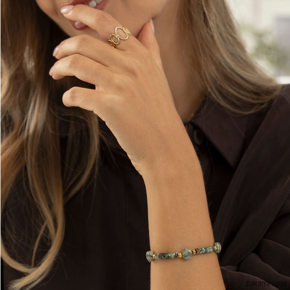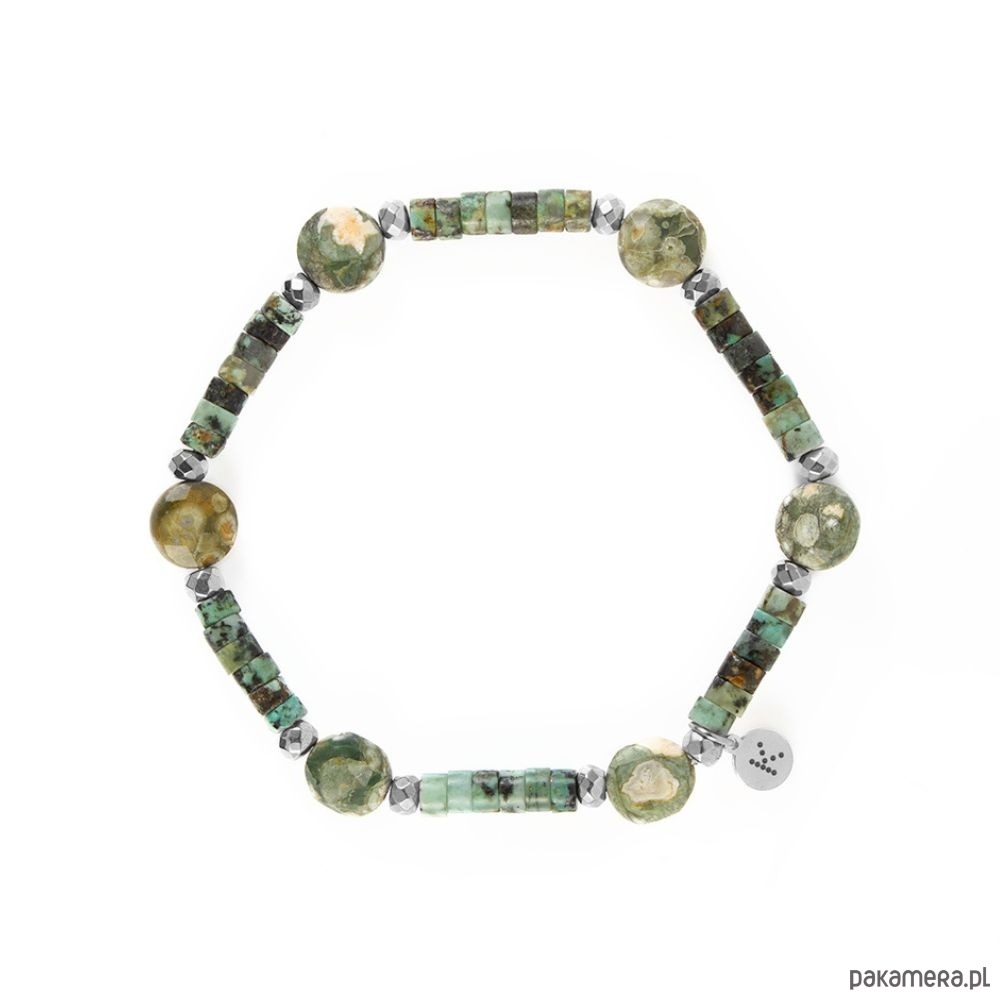 Ta bransoletka to połączenie trzech naturalnych kamieni o wyjątkowej energii – Riolitu, Turkusu Afrykańskiego i Hematytu. Ich naturalne, ziemiste odcienie zieleni i złota tworzą harmonijną kompozycję, która symbolizuje spokój, siłę i równowagę. Riolit to kamień wewnętrznej przemiany i harmonii. Pomaga przechodzić przez życiowe zmiany z odwagą i spokojem, wspierając rozwój osobisty i akceptację siebie. Jego naturalne barwy przywodzą na myśl krajobrazy natury, wprowadzając równowagę i ukojenie. Turkus Afrykański symbolizuje odrodzenie i nowe początki. To kamień pozytywnej energii, który pomaga odzyskać spokój, wzmacnia intuicję i przyciąga dobre wibracje. Wspiera emocjonalną równowagę i harmonię z naturą. Hematyt to kamień siły i odwagi. Stabilizuje emocje, wzmacnia poczucie bezpieczeństwa i ugruntowuje energię, dodając przy tym elegancji dzięki swojemu subtelnemu, metalicznemu połyskowi. Każda bransoletka wykonywana jest ręcznie z naturalnych kamieni, dzięki czemu każdy egzemplarz jest niepowtarzalny – tak jak energia osoby, która ją nosi. Znaczenie kamieni: Turkus afrykański to kamień podróżników. Pełen energii talizman, wzmacniający odwagę i intuicję podróżujących oraz sprzyjający nowym przyjaźniom. Hematyt to kamień wojowników. Silnie oczyszcza krew. Budzi radość do życia, dodaje odwagi i wiary we własne umiejętności. Riolit to kamień wewnętrznej przemiany i równowagi. Pomaga przejść przez życiowe zmiany z odwagą i spokojem, wspierając proces głębokiej transformacji. Uczy akceptacji siebie i otwiera na rozwój osobisty, dzięki czemu uznawany jest za minerał odnowy i harmonii. Każda bransoletka różni się nieco od siebie, ponieważ nie ma dwóch takich samych kamieni. Dla klienta wybieramy kamienie z wielką starannością, zawsze intuicyjnie.