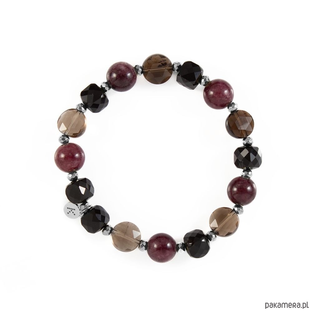 Ta bransoletka to połączenie czterech kamieni, które razem tworzą elegancką i energetycznie zrównoważoną kompozycję. Jadeit w odcieniach głębokiego fioletu symbolizuje spokój, harmonię i dobrobyt – przyciąga pozytywną energię oraz wspiera wewnętrzną równowagę. Kwarc Dymny działa uspokajająco, pomaga redukować stres i chroni przed negatywnymi emocjami, wprowadzając subtelny balans między ciałem a umysłem. Czarny Turmalin to kamień ochrony i siły – tworzy tarczę energetyczną, wzmacnia pewność siebie i pomaga zachować spokój w trudnych chwilach. Całość dopełnia Hematyt, dostępny w wersji złotej lub srebrnej, który symbolizuje stabilizację, determinację i wewnętrzną równowagę. Jego metaliczny połysk nadaje bransoletce elegancki charakter, podkreślając głębię i kontrast naturalnych kamieni. To biżuteria pełna znaczeń, łącząca subtelność i siłę – idealna dla kobiet, które pragną zachować spokój, harmonię i pewność siebie każdego dnia.