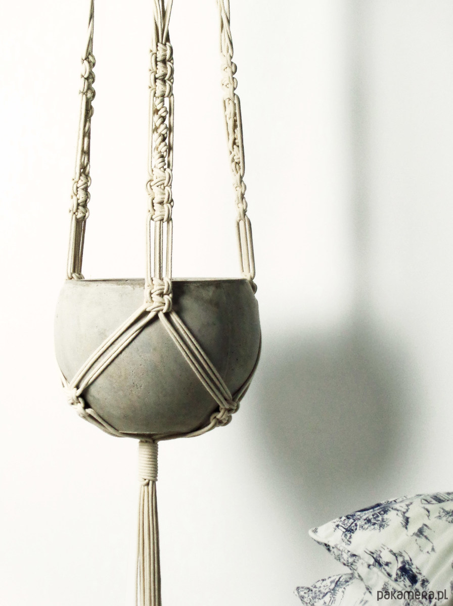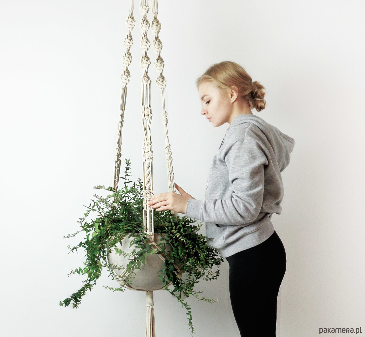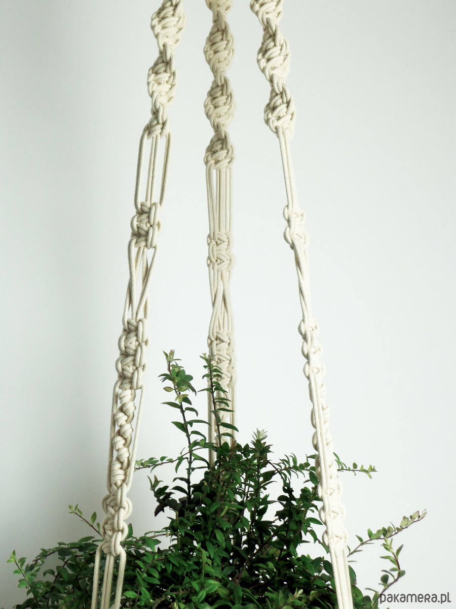 Makramowy kwietnik w rozmiarze XXXL, wykonany z naturalnego sznurka bawełnianego. Polecany do dużych przestrzeni, szczególnie salonu i sypialni.
